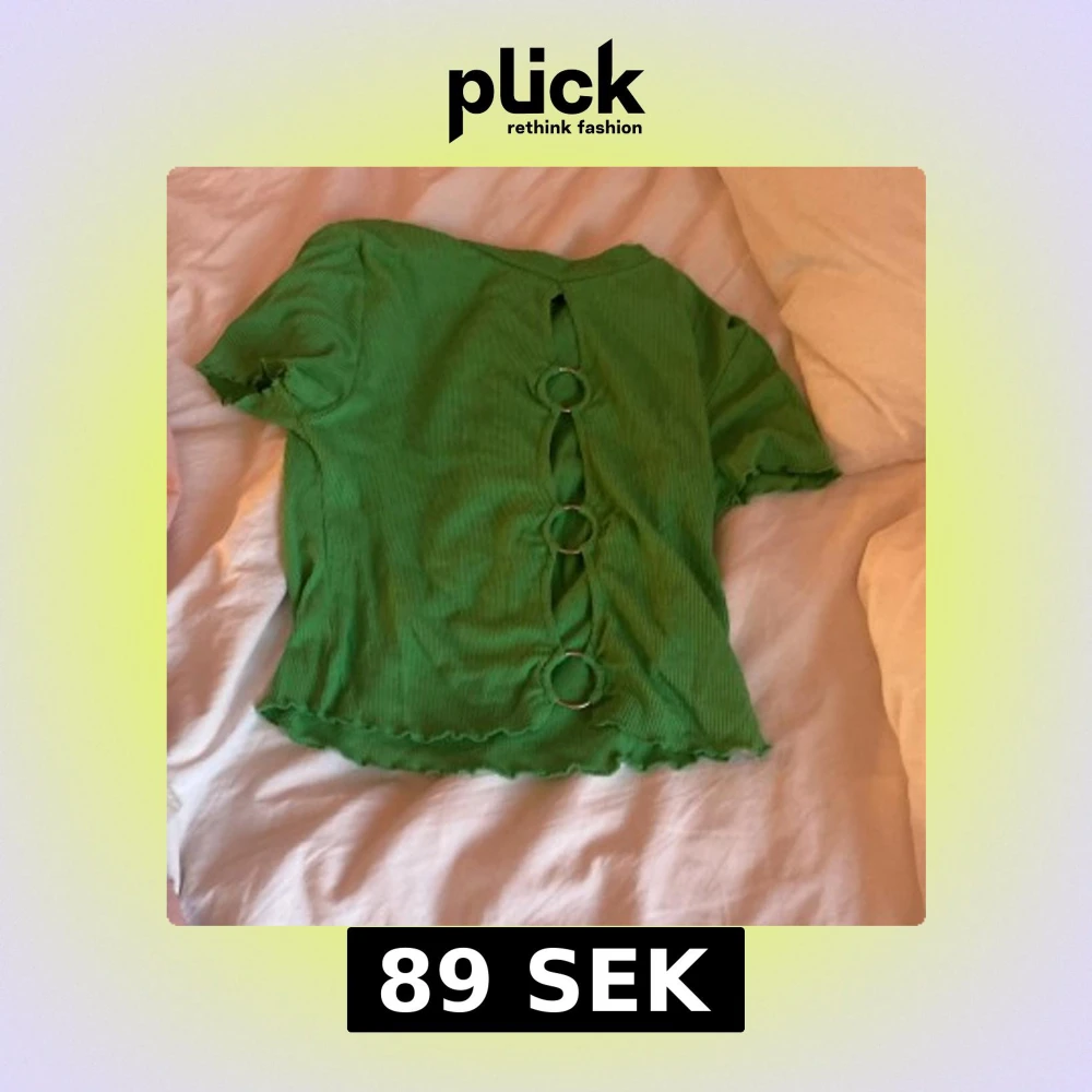 Grön ribbad topp från RB Sister med korta ärmar och fyra silverfärgade ringar längs överkroppen som skapar en öppen effekt. Toppen har vågig kant nertill och är croppad i modellen. Perfekt för dig som gillar unika detaljer!