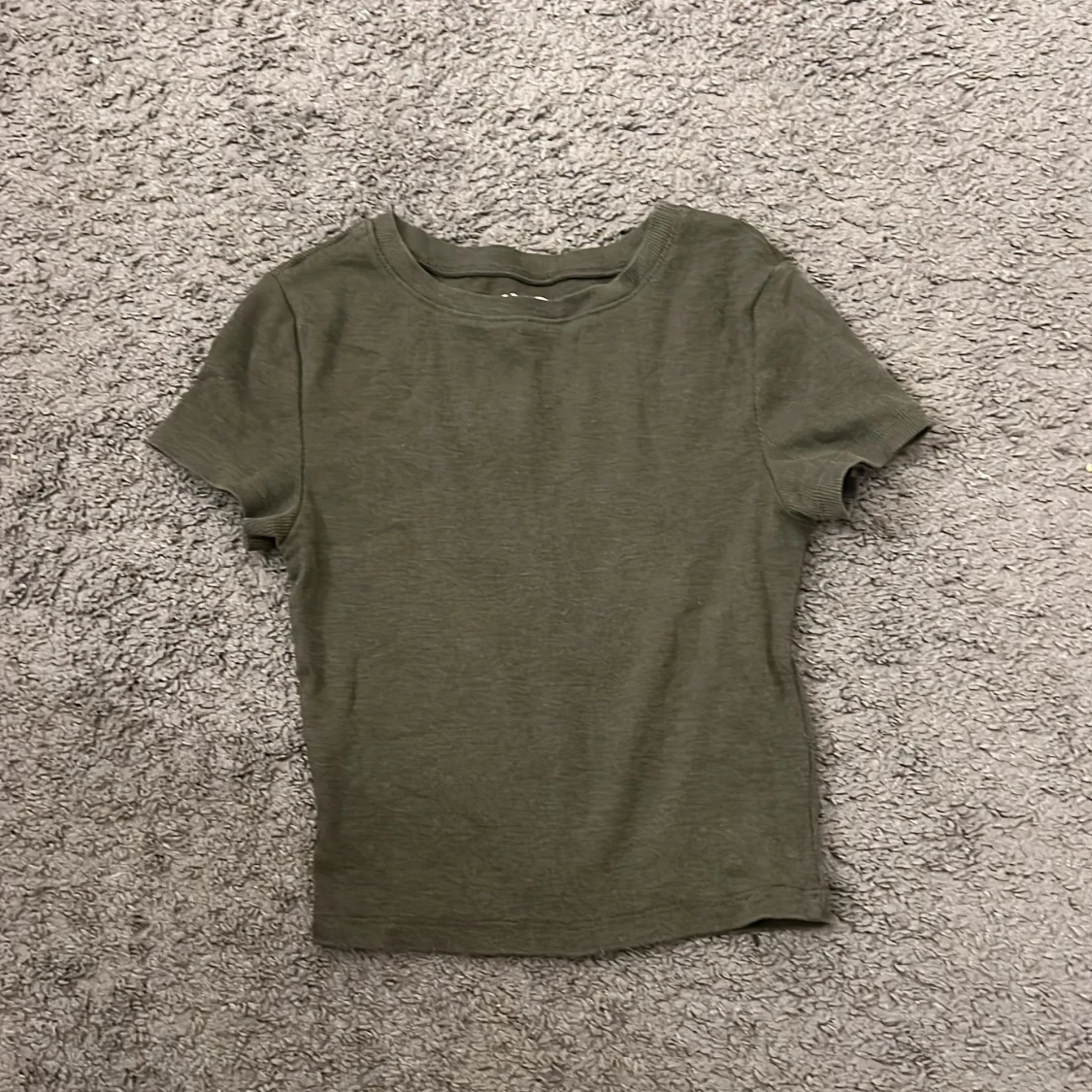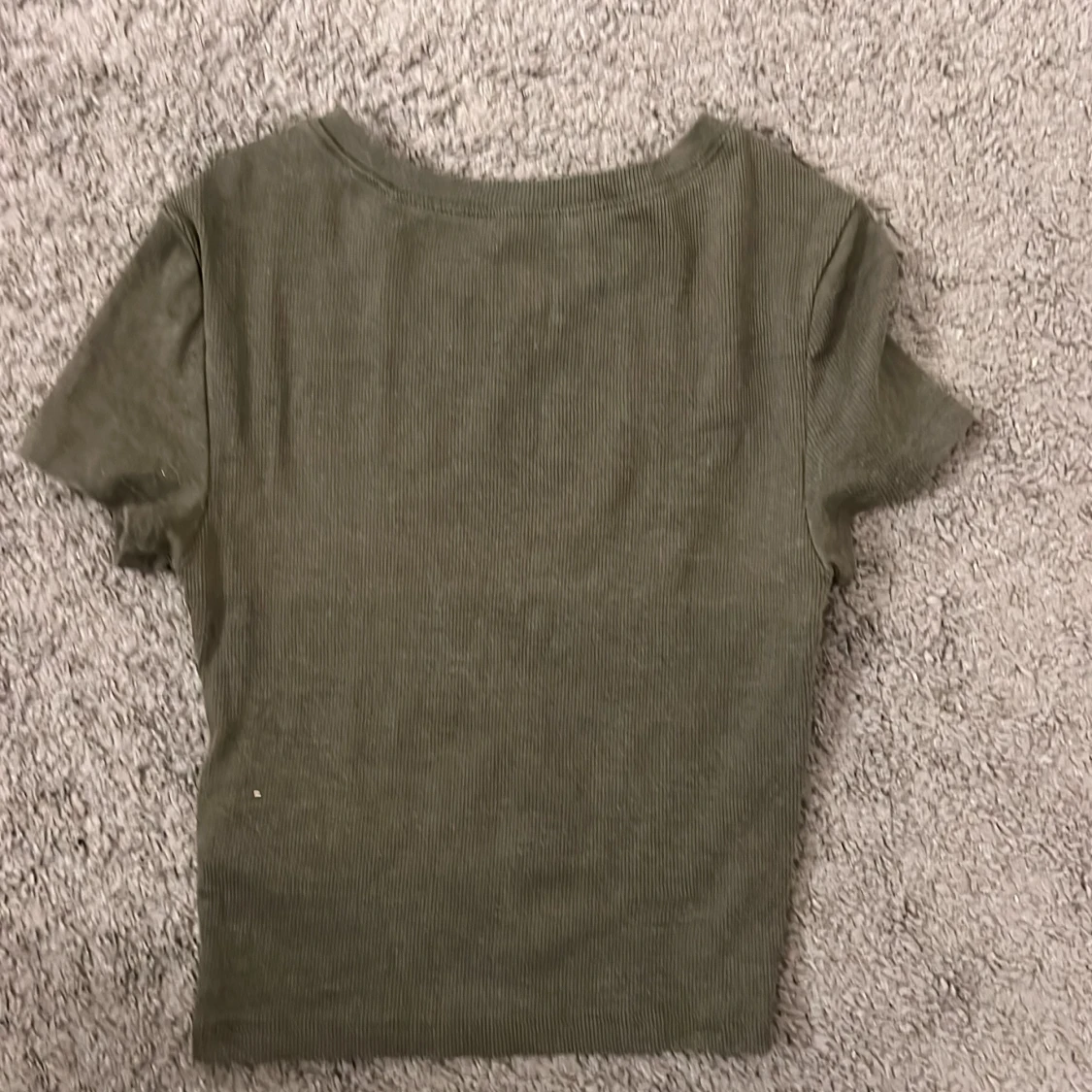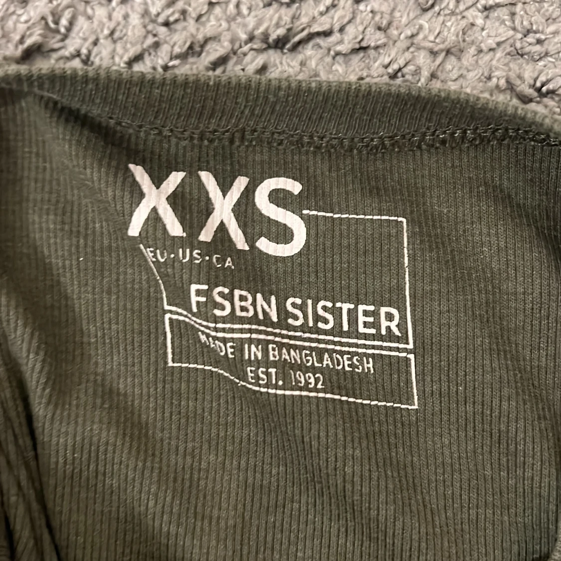 Säljer en olivgrön ribbad topp från FSBN Sister i storlek XXS. Toppen har rund halsringning och korta ärmar, tillverkad i mjuk bomull. Enkel och stilren design som är lätt att matcha med dina favoritjeans eller kjol.