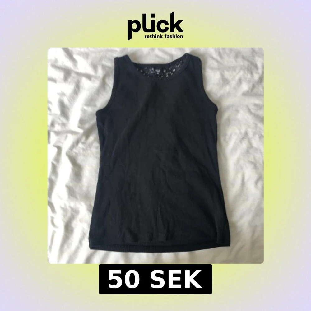 Svart ärmlös linnetopp från Next med rund halsringning. Baksidan har en snygg spetsdetalj upptill som ger toppen en extra touch. Perfekt att matcha med jeans eller kjol.