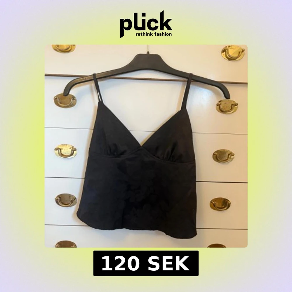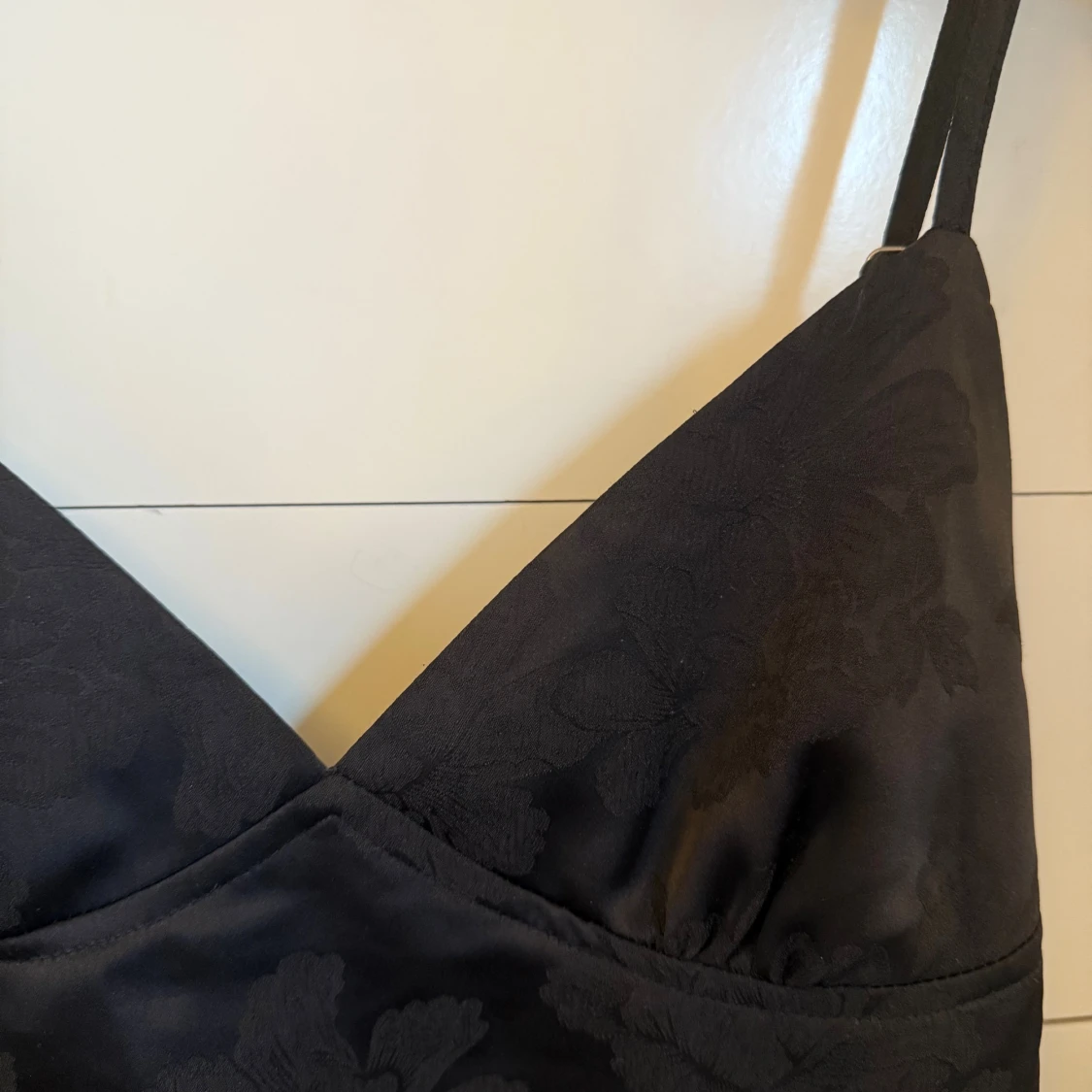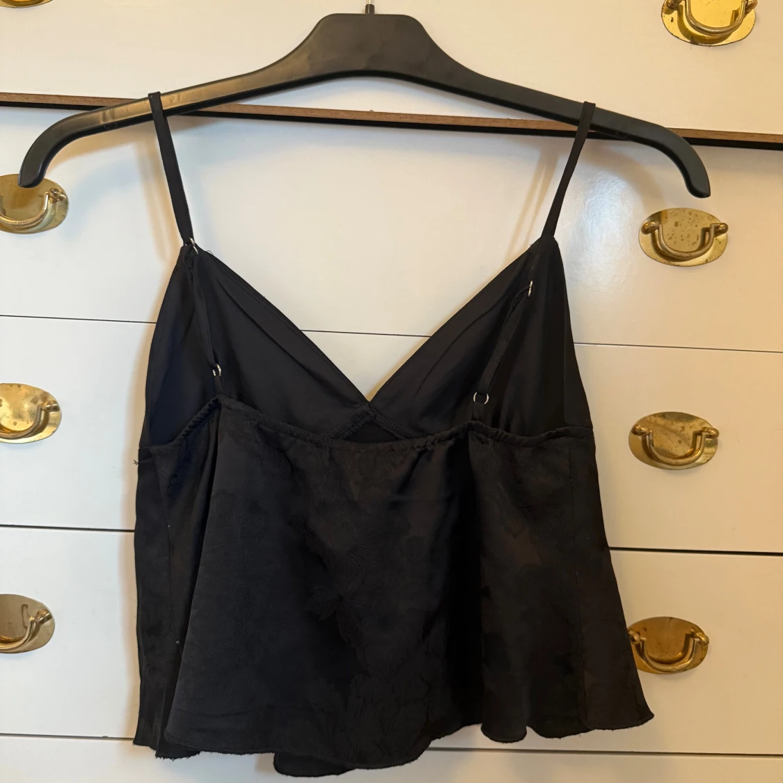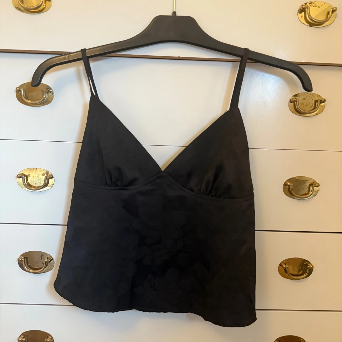 Snygg svart linnetopp med subtilt blommönster och smala axelband. Toppen har v-ringad hals och är croppad, vilket ger en trendig look. Materialet är glansigt och känns lyxigt, perfekt för att lyfta vilken outfit som helst.
