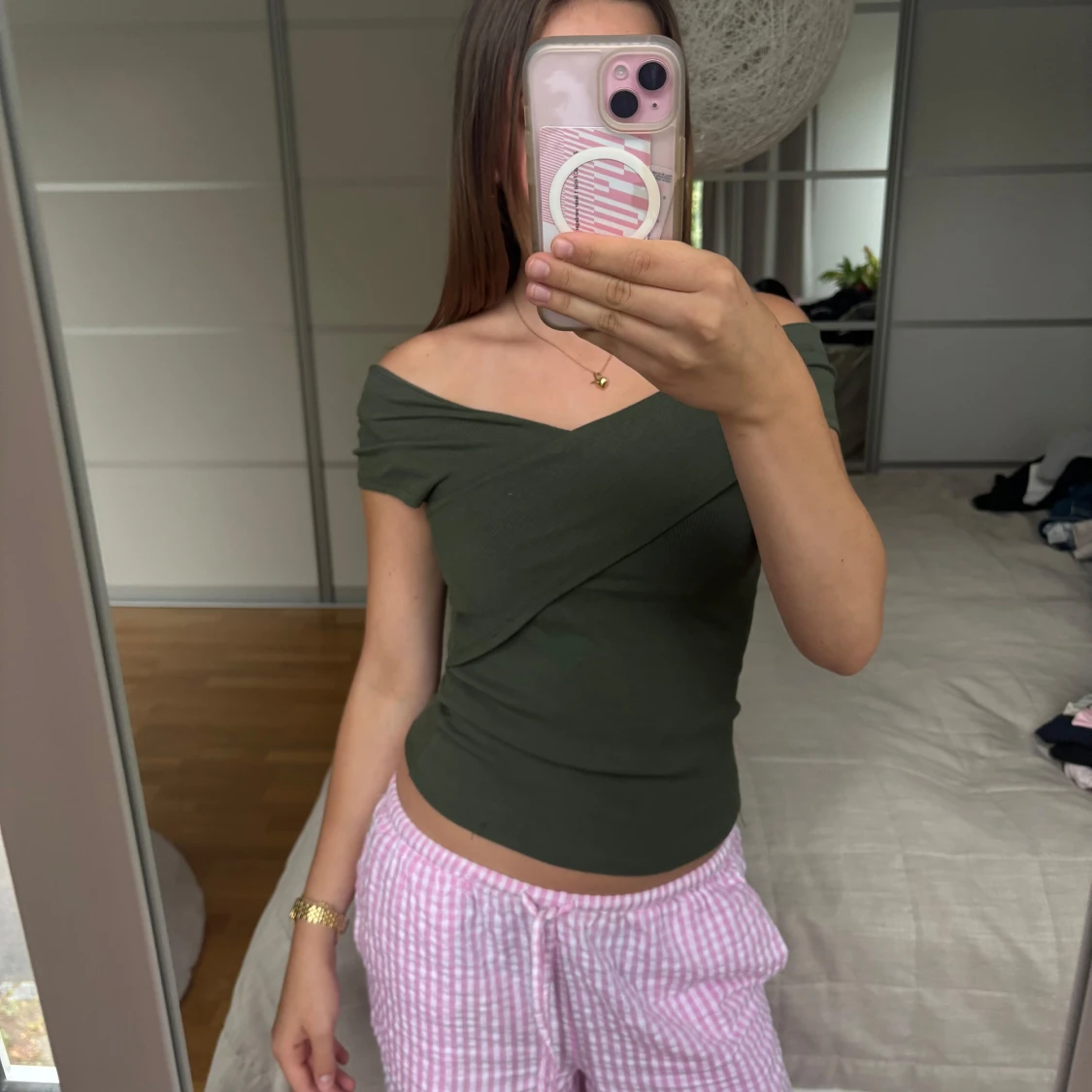 Snygg mörkgrön topp med offshoulder-design och ribbad struktur. Figurnära passform och omlott-detalj framtill ger en trendig look. Perfekt att styla med både jeans och kjol för en cool vibe. Köpt på en spansk marknad så vet inte exakta storlek och har inget märke.