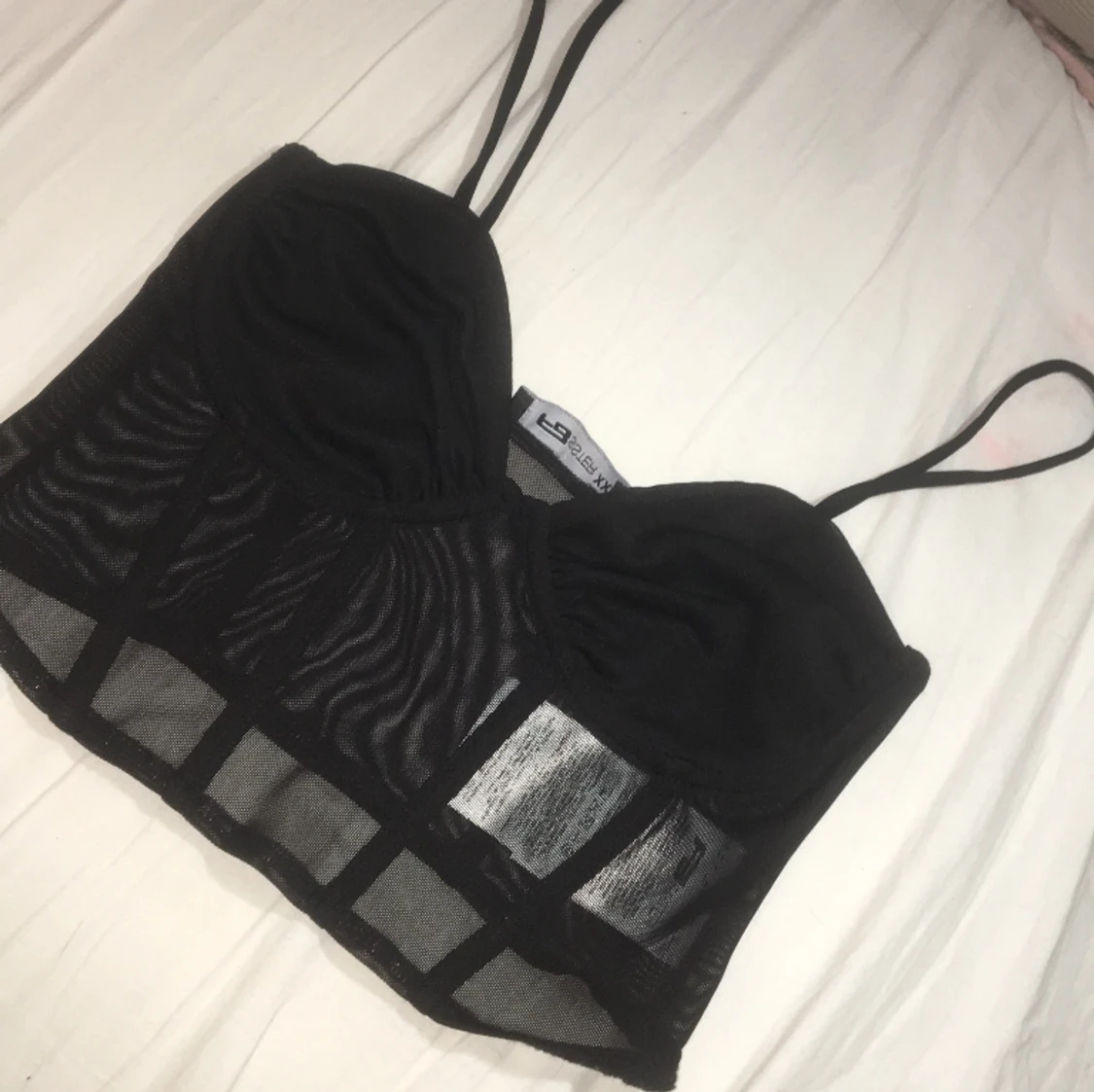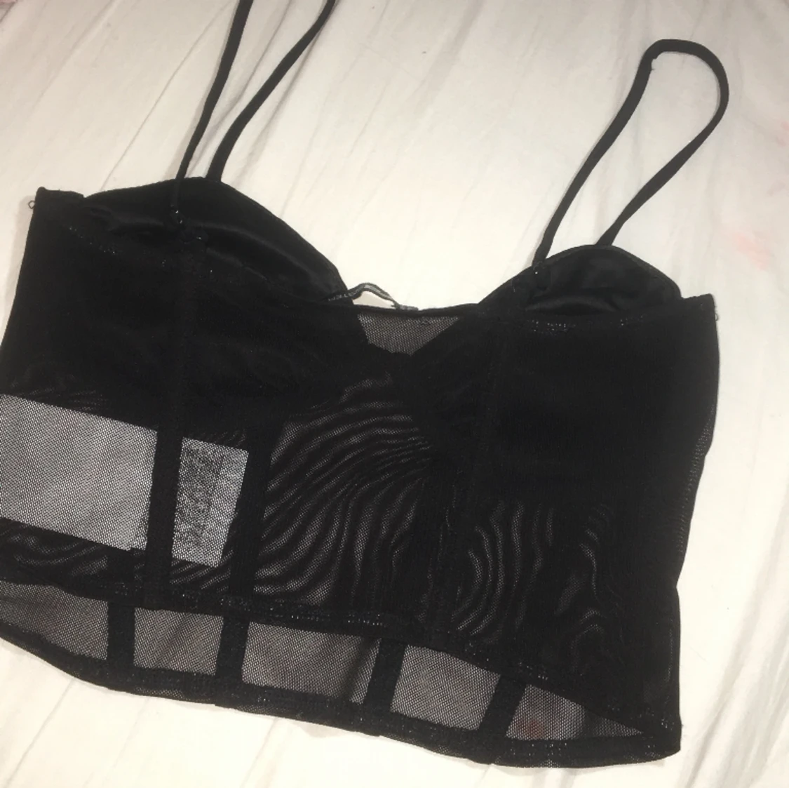 Storlek XXS, den är svart med silkes mateial inuti brösten och ganska hårt material annars. Den är från New yorker och köptes länge sen men är jättebra kvalite men för liten. Den är stretchig också. 💓