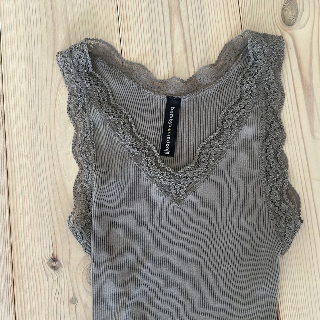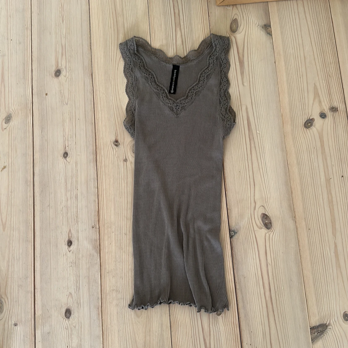 Supersöt ribbad grå linnetopp från Bompys & Sindong med v-ringning och spetsdetaljer längs kanterna. Toppen är väldig streckig och har vågig kant nertill. mjukt material som känns skönt mot huden. Skulle säga att toppen passar S-M