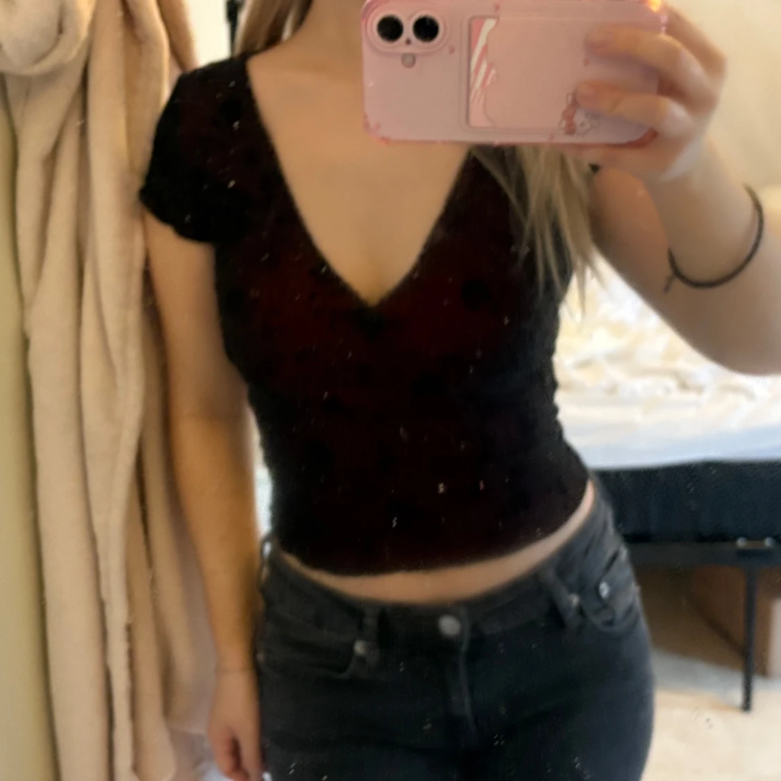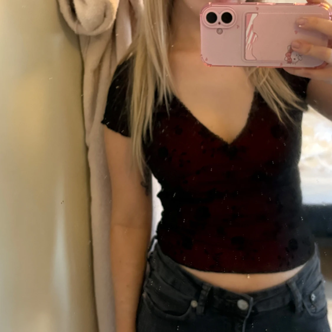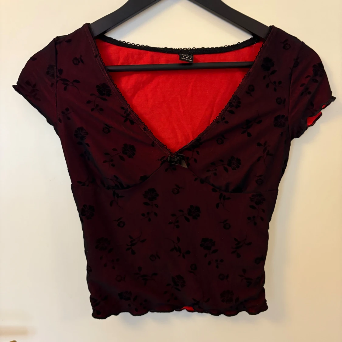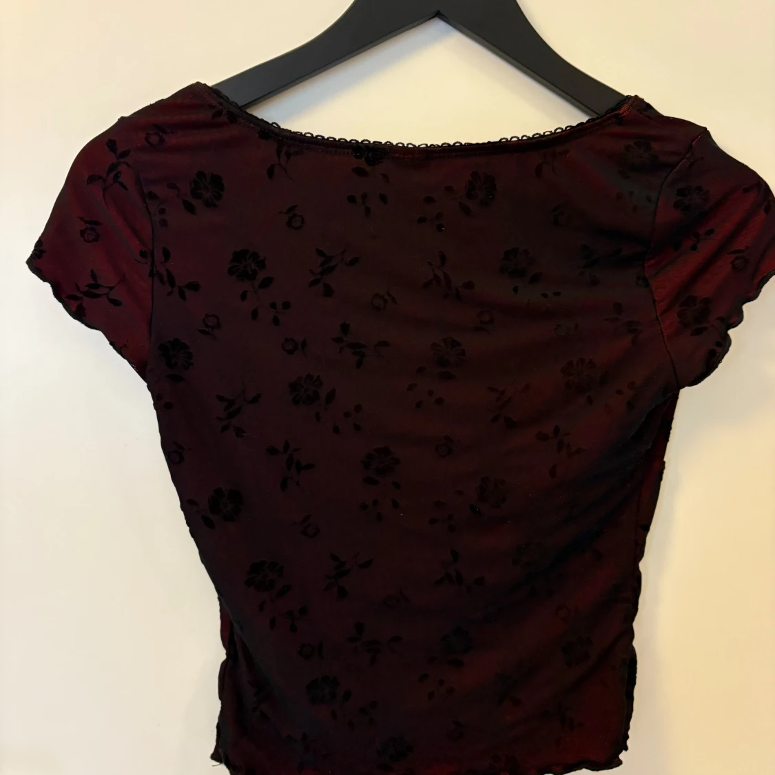 Snygg vinröd topp med blommigt mönster och spetsdetaljer vid halsringningen. Knappt använd!
