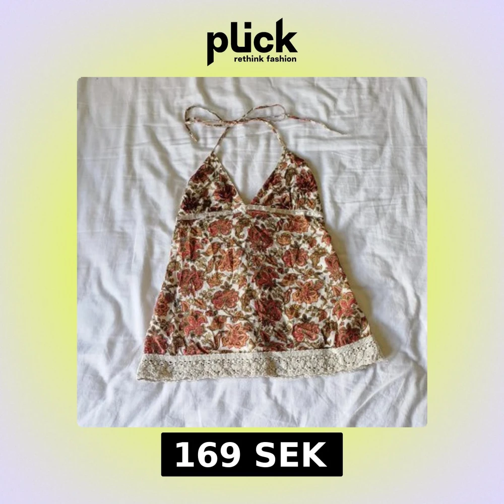 Supersöt linnetopp med blommigt mönster i beige, rött och brunt. Halterneck med knyt i nacken och ryggen. Dekorativ spetskant nertill och pärldetaljer vid brösten. Perfekt för sommarens varma dagar. Storlek 38 på lappen men mer som en 36.