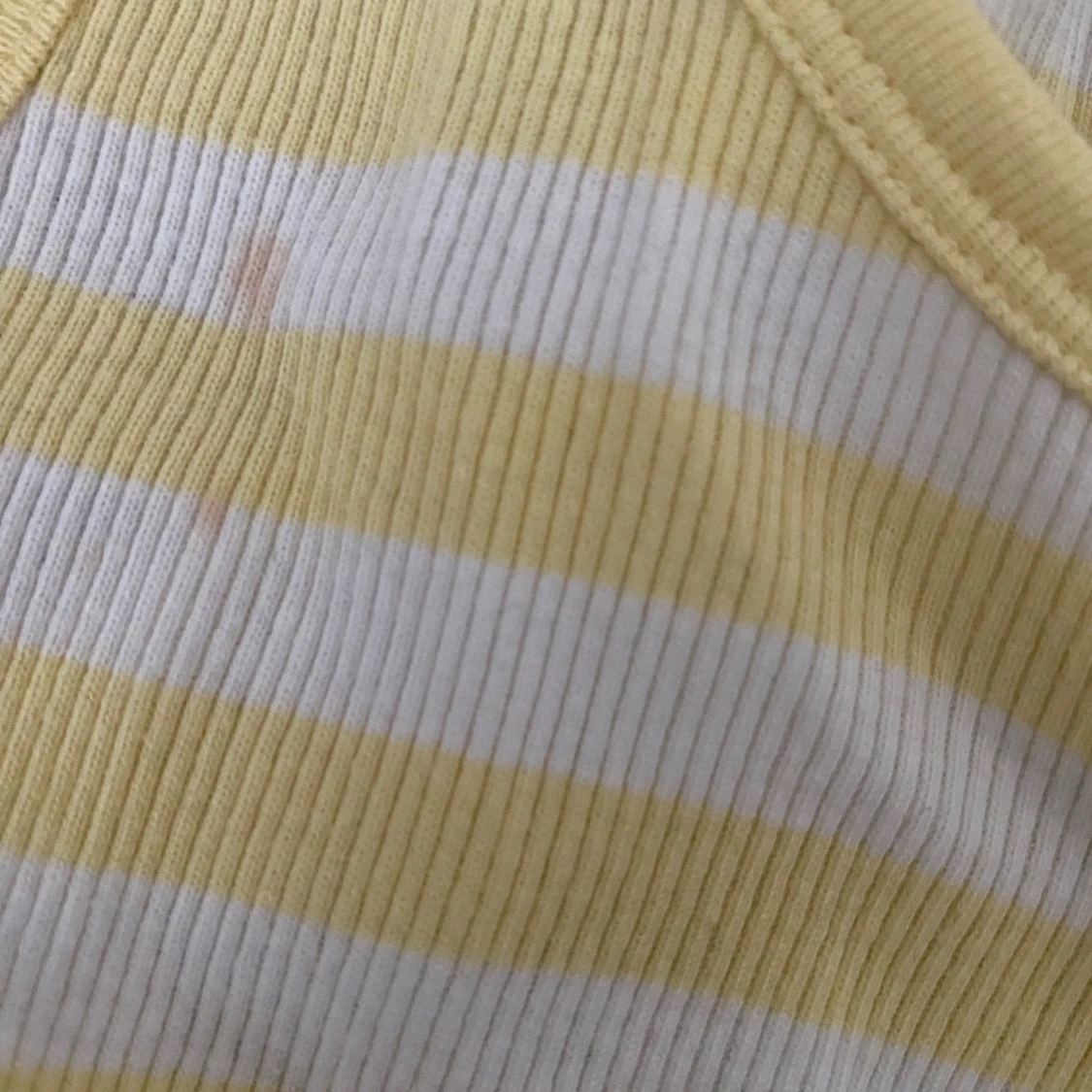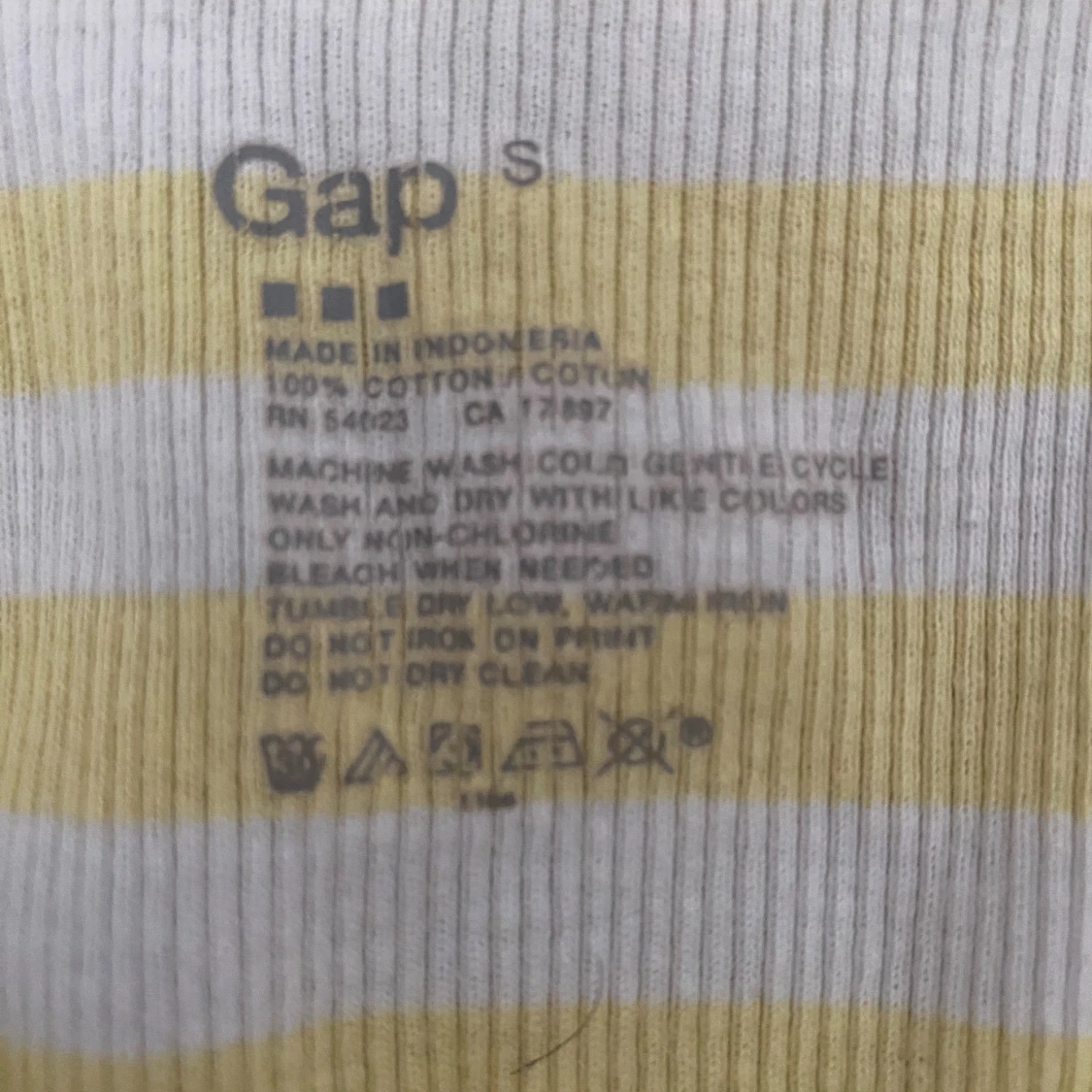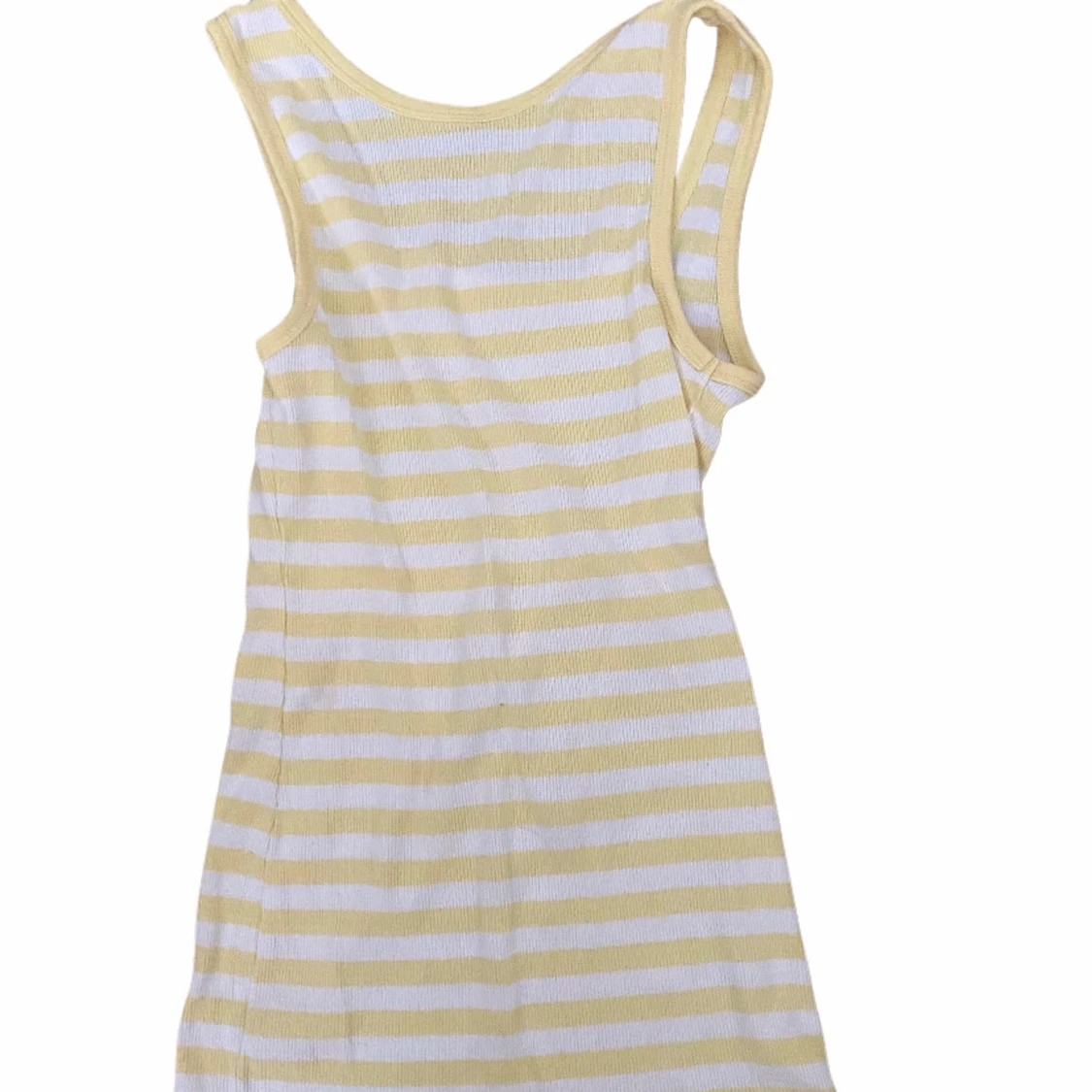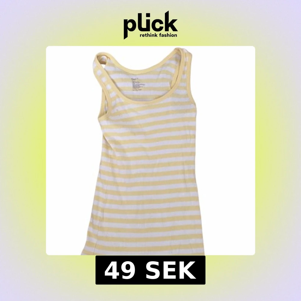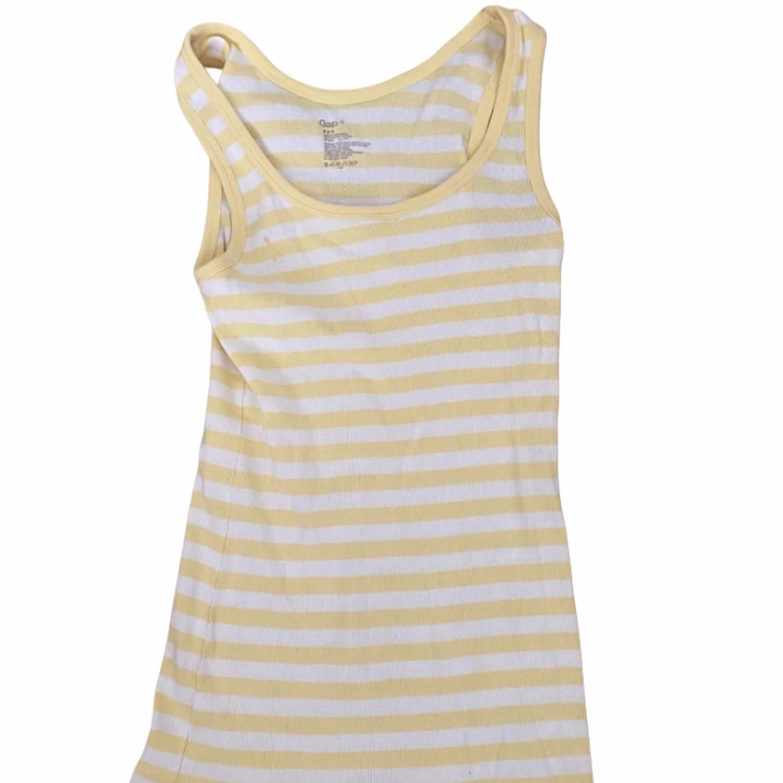 Söt Ă€rmlöst linne frĂ„n Gap i gul och vit randigt mönster. Tillverkad i 100% bomull, med rund halsringning. Strl Sđliten flĂ€ck i vĂ€nstra hörnet, (se sista bilden)
