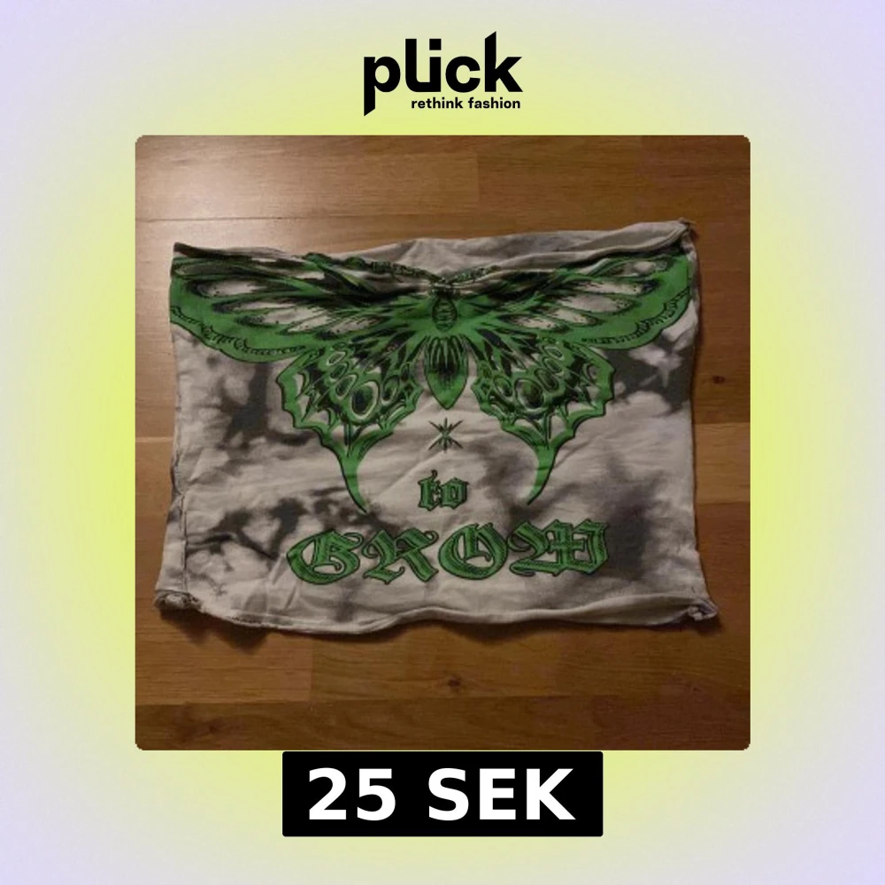 Snygg tubtop med ett stort grönt fjärilsmotiv och text i gotisk stil. Toppen har en batikmönstrad bas i svart och vit. Knappt använd förutom när jag först provade den.