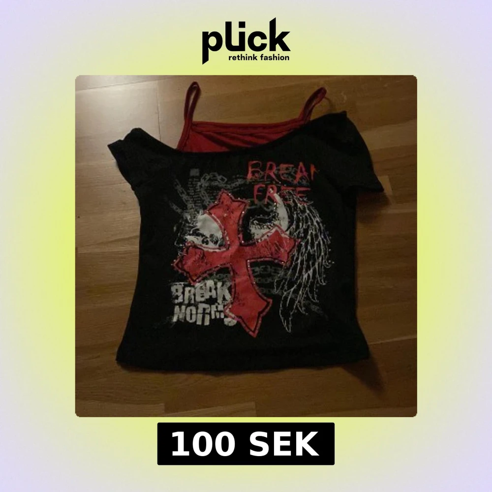 Säljer en svart offshoulder topp med ett stort rött kors och texten 'Break Free' i vitt och rött. Toppen har smala axelband och en cool, edgy design. Perfekt för en unik stil! Bara använd en gång och det var när jag provade den