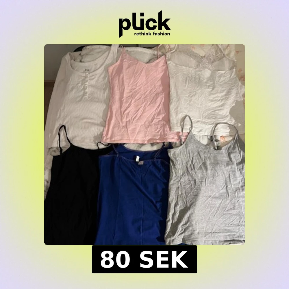 Säljer ett paket med sex linne-toppar i olika färger: vit, rosa, svart, blå, grå och en vit med spetsdetalj.