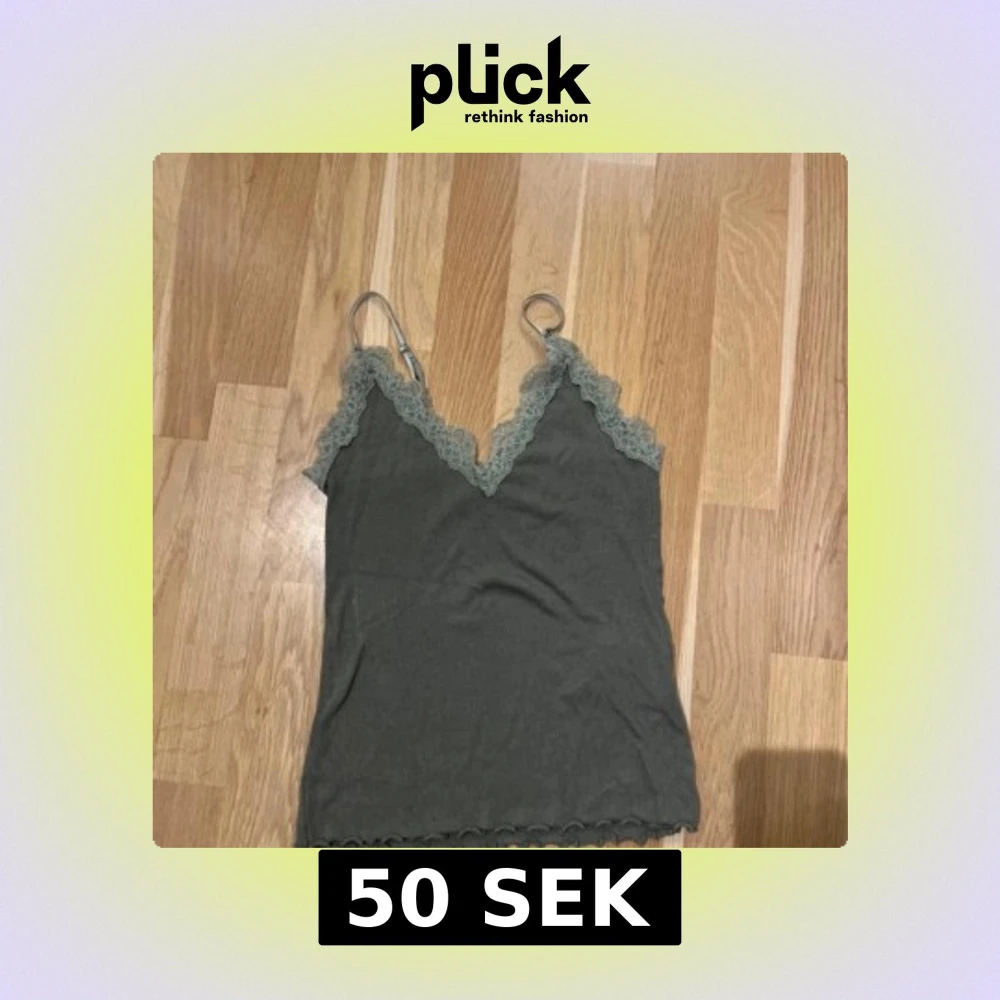 Supersnygg grå linnetopp med tunna axelband och v-ringad spetskant i ljusgrönt, hela toppen är ljusare än på bild. Toppen har en croppad passform och vågig kant nedtill. Perfekt att styla med jeans eller kjol för en chill look.