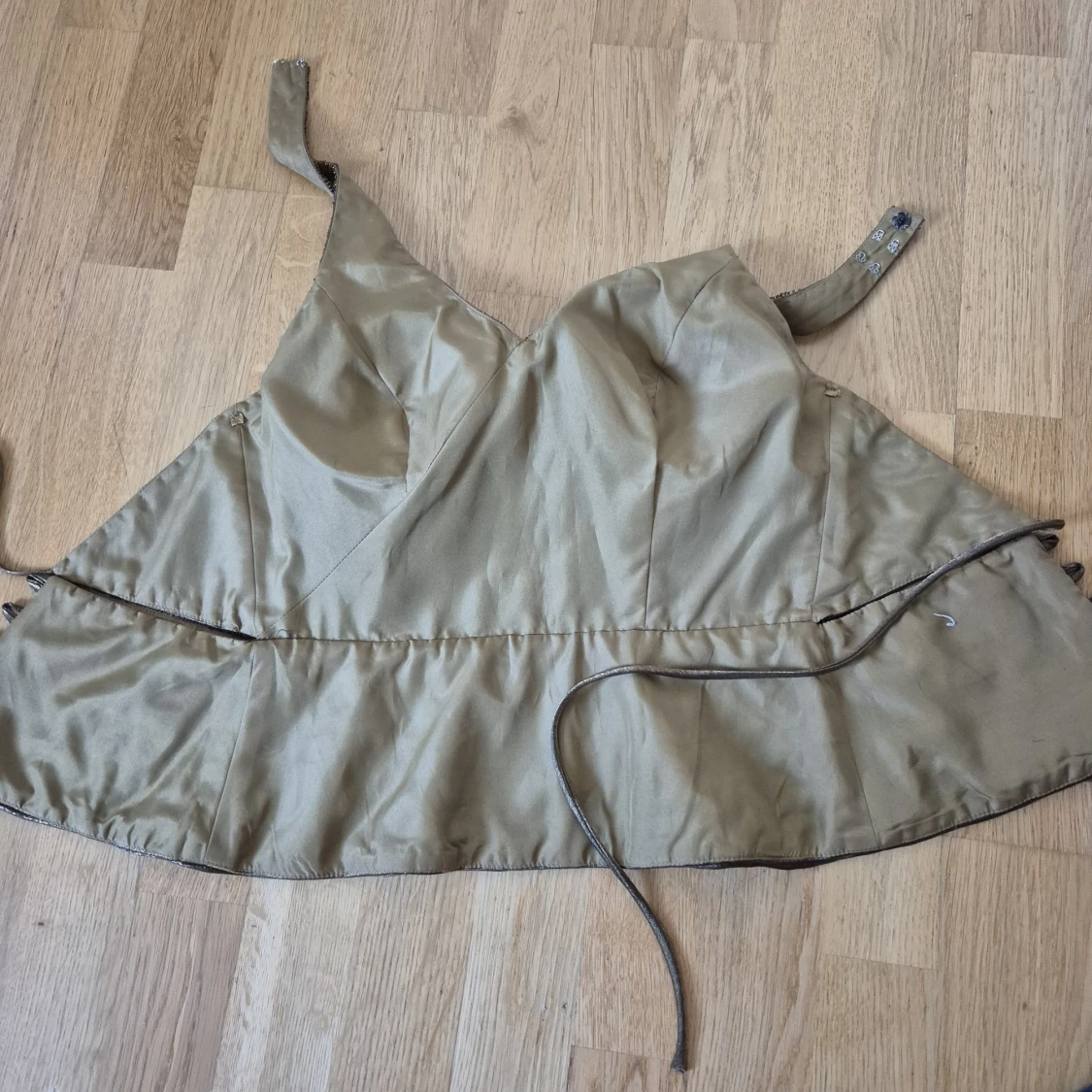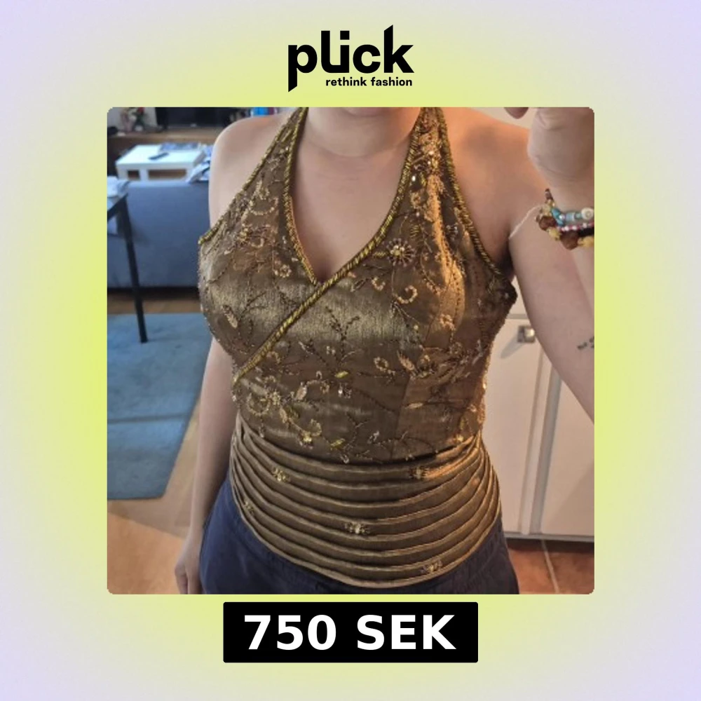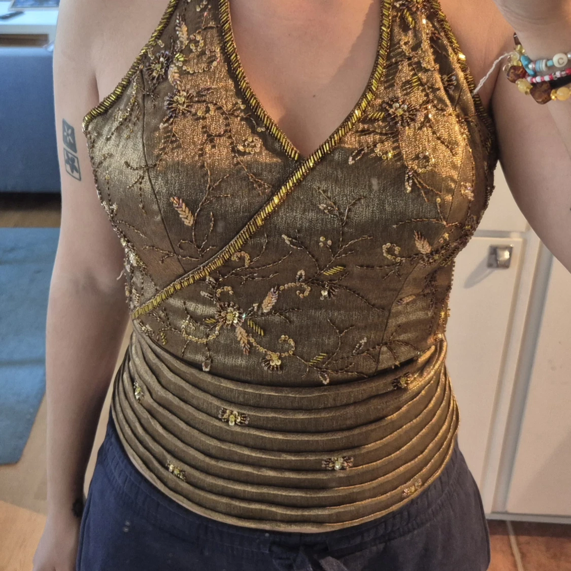 Unique golden corset top with embroidered flowers and pearls, wrap-around cut and halterneck. Thick waistband with pleated details and glittery sequins. Perfect for those who want to stand out with a luxurious and detailed look. I would say size M-S as you can tie it yourself how tight you want it.