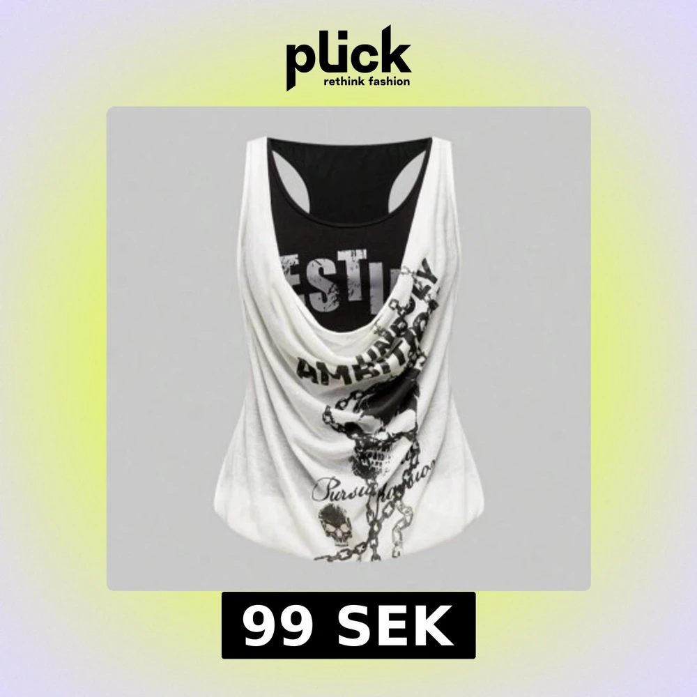 Cool linnetopp i vitt och svart med tryck av kedjor, dödskalle och text som 'Chase your goals'. Toppen har draperad framsida och sportig rygg. Perfekt för dig som gillar edgy streetstyle och vill sticka ut.