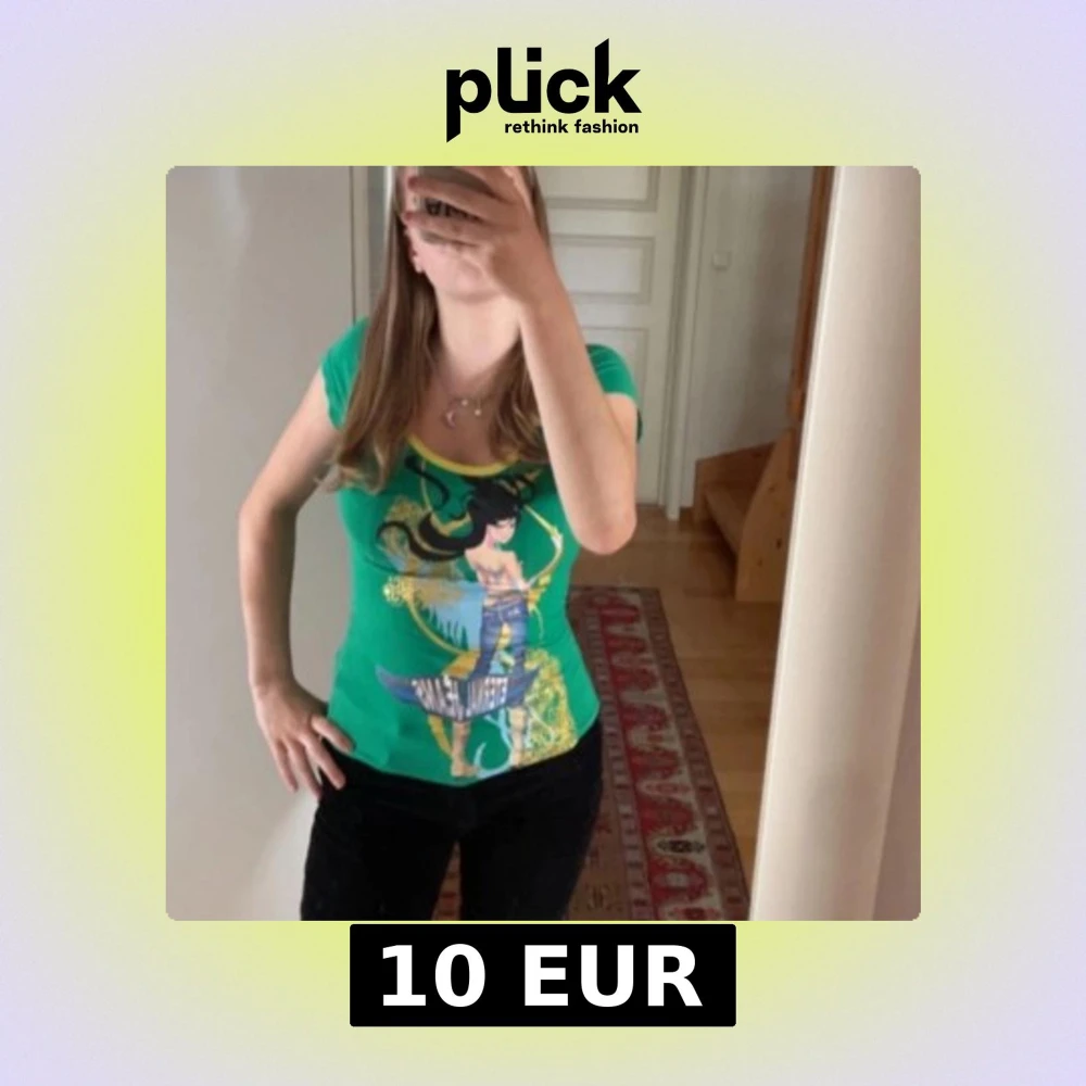 Säljer en grön y2k t-shirt med coolt tryck av en tecknad tjej på framsidan. T-shirten har korta ärmar och gul kant runt halsen. Perfekt för dig som gillar färgglada och unika plagg!