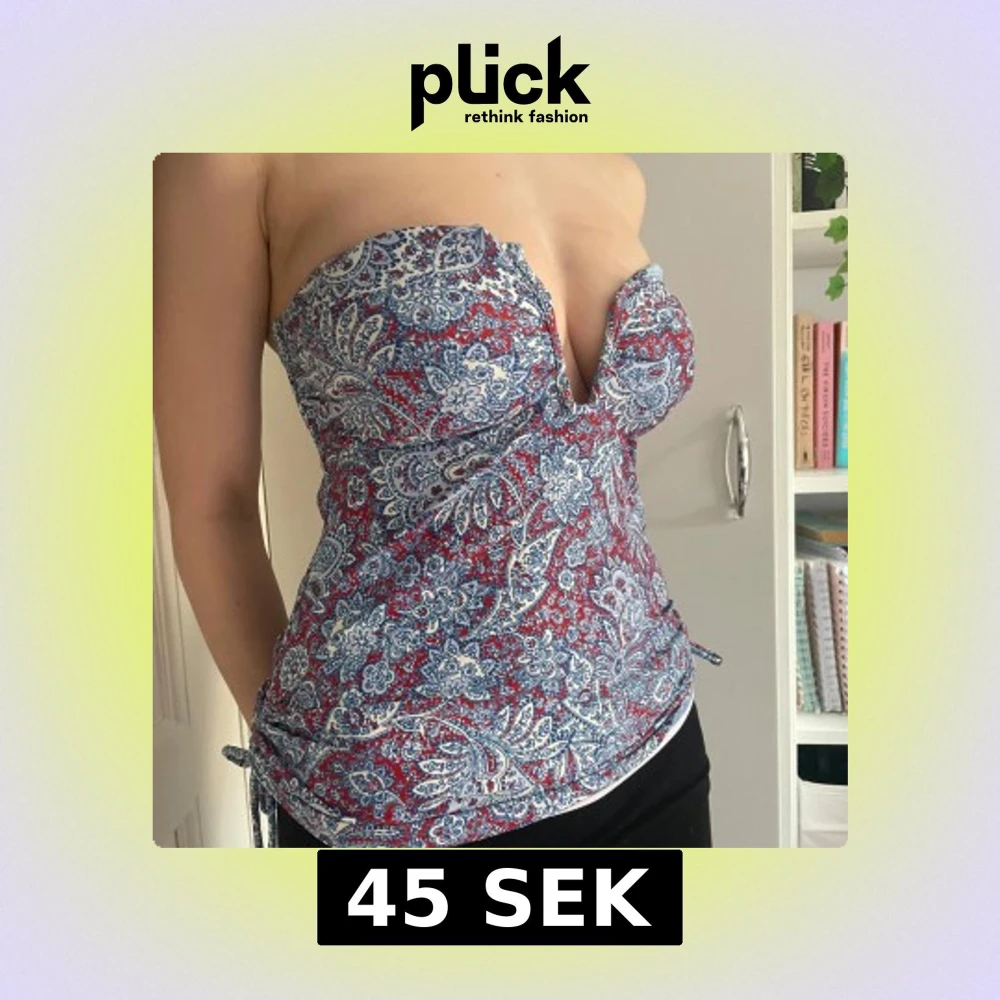 Säljer en färgglad tubtopp med blått och rött paisleymönster. Toppen är axelbandslös och har knyt i ryggen för en justerbar passform. Storlek M men passar fler eftersom den knyts. Perfekt för varma dagar och ger en snygg siluett.