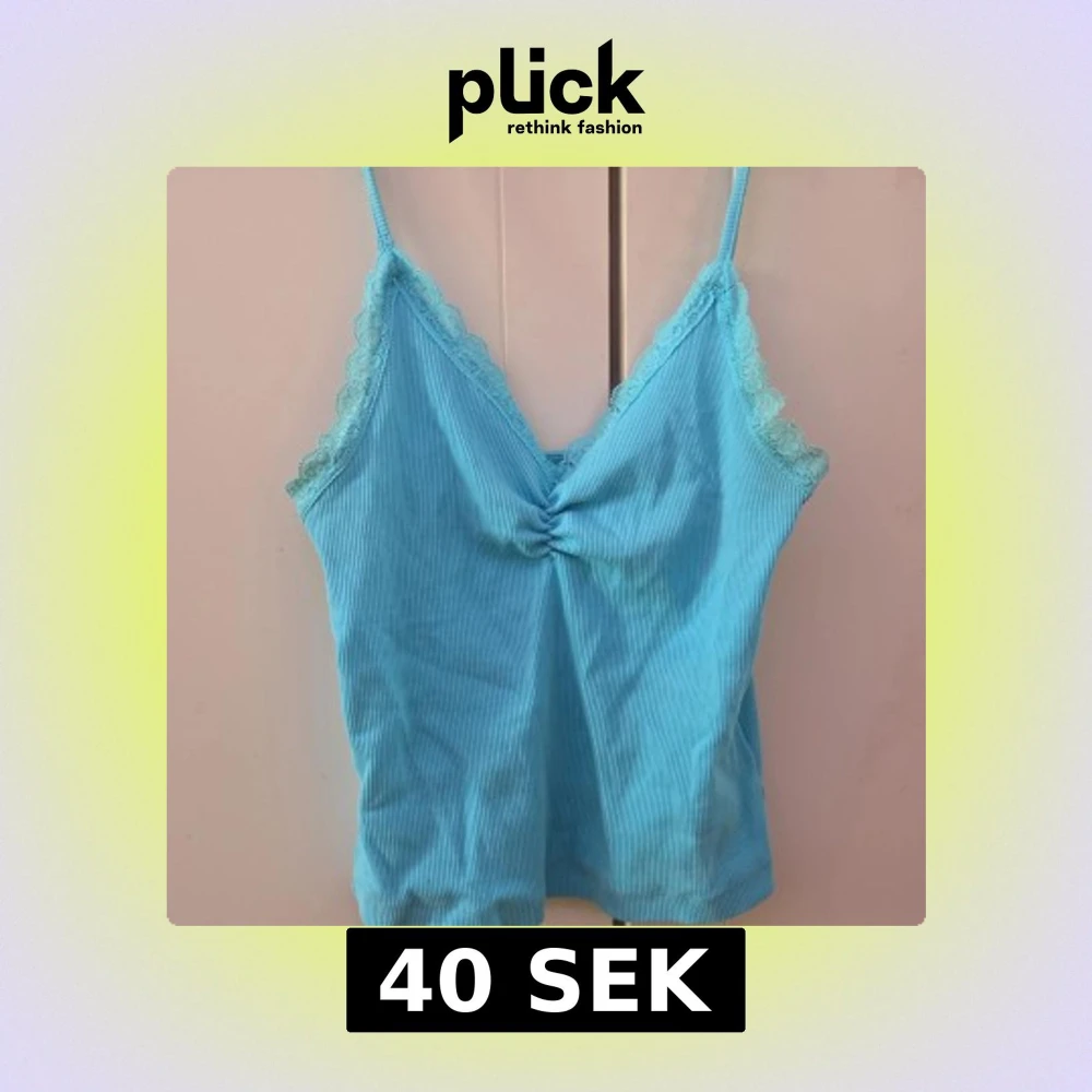 Säljer en söt turkos ribbad linnetopp med smala axelband och spetsdetaljer längs kanterna. Toppen har en knytdetalj framtill som ger en fin passform. Perfekt för varma sommardagar eller som ett lager under en kofta.