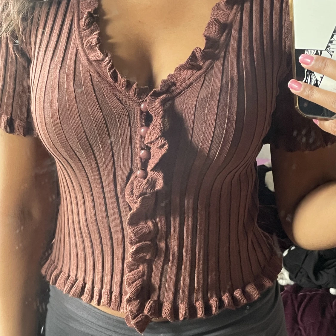 Jättesöt brun kortärmad top med knappar och detaljer, använts ca 2 gånger och är i god skick!