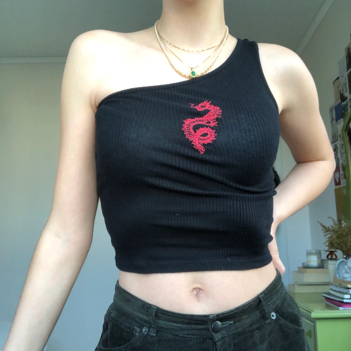One shoulder top med broderat drakmotiv superbra skick ifrĂ„n Urban Outfitters â€ïžđ€