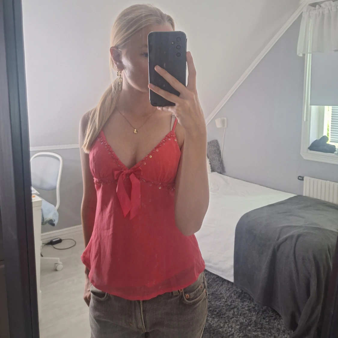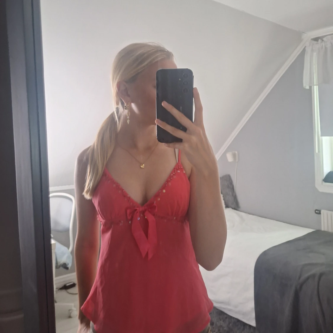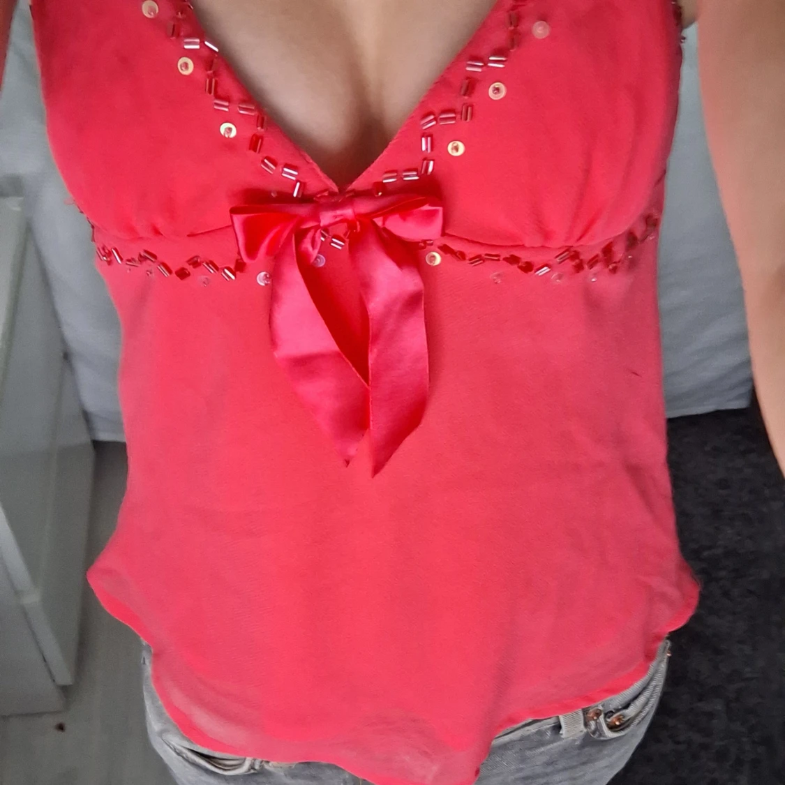 Supersöt rosa linnetopp med smala axelband, v-ringning och en stor rosett framtill. Toppen har glittriga paljettdetaljer längs urringningen. Unikt och fint linne från gina tricot! 💞☺️