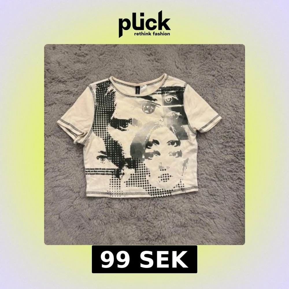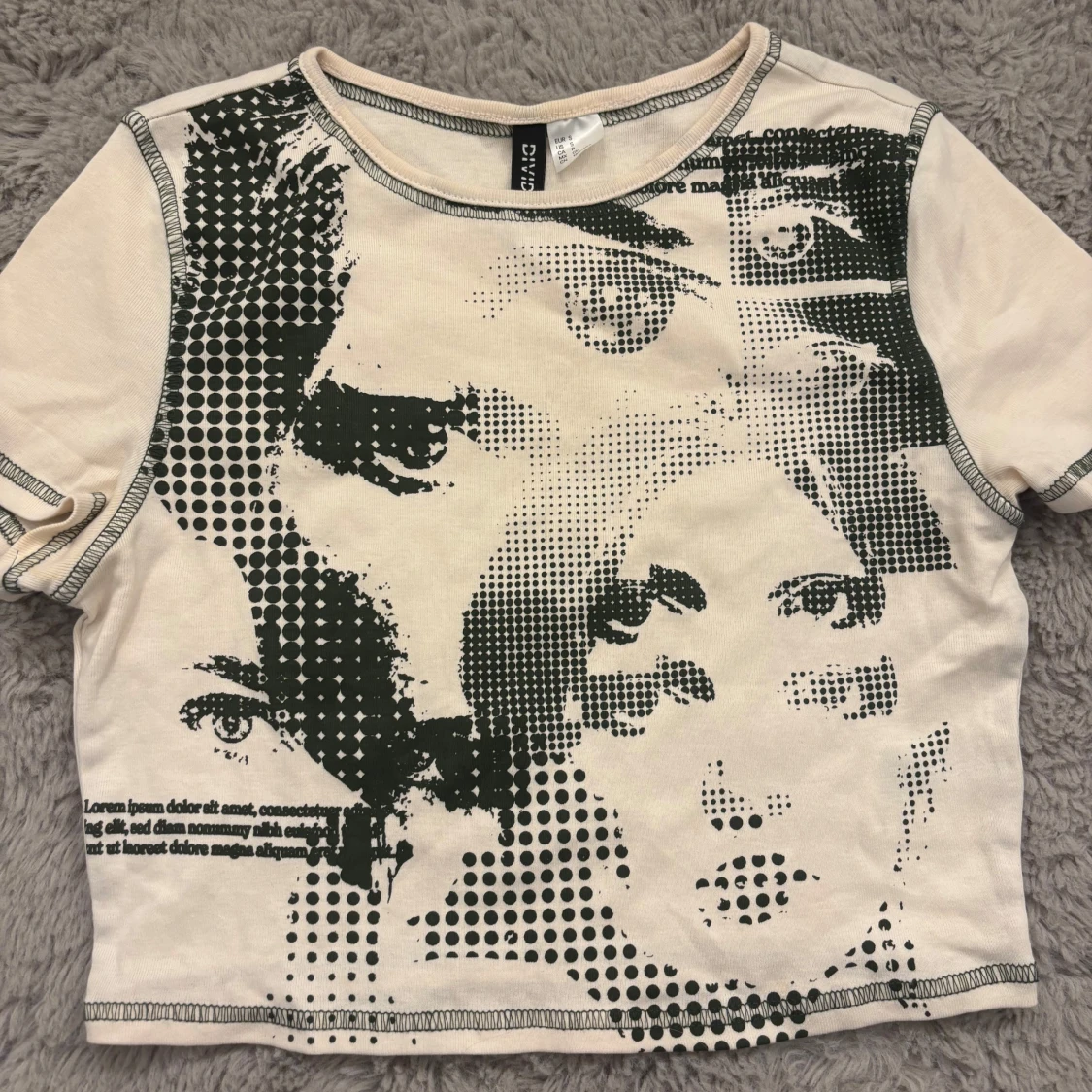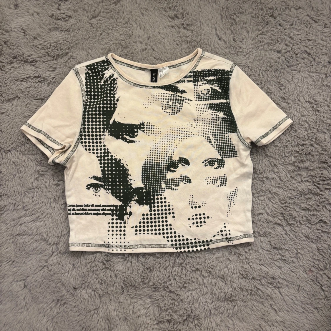 Cool croppad topp från Divided i beige med svart grafiskt ansiktsmönster framtill. T-shirten har korta ärmar, kontrastsömmar och en tight passform. Perfekt för dig som gillar edgy och unik stil.