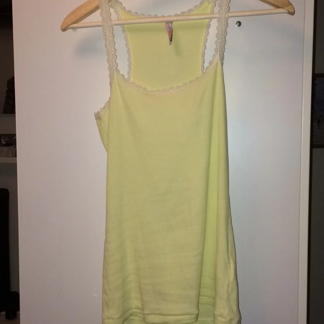 Ribbat, blekgult linne från Fishbone. Spets kanter vid urringning, ärmar och rygg. Söt till svarta jeans. Något genomskinligt. Köparen betalar frakt!