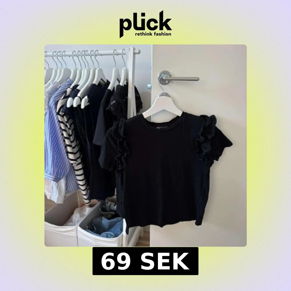 Svart topp från Zara med korta ärmar och snygga volangdetaljer på axlarna. Enkel men ändå trendig, perfekt att matcha med jeans eller kjol. Mjuk bomullskänsla och rund halsringning.