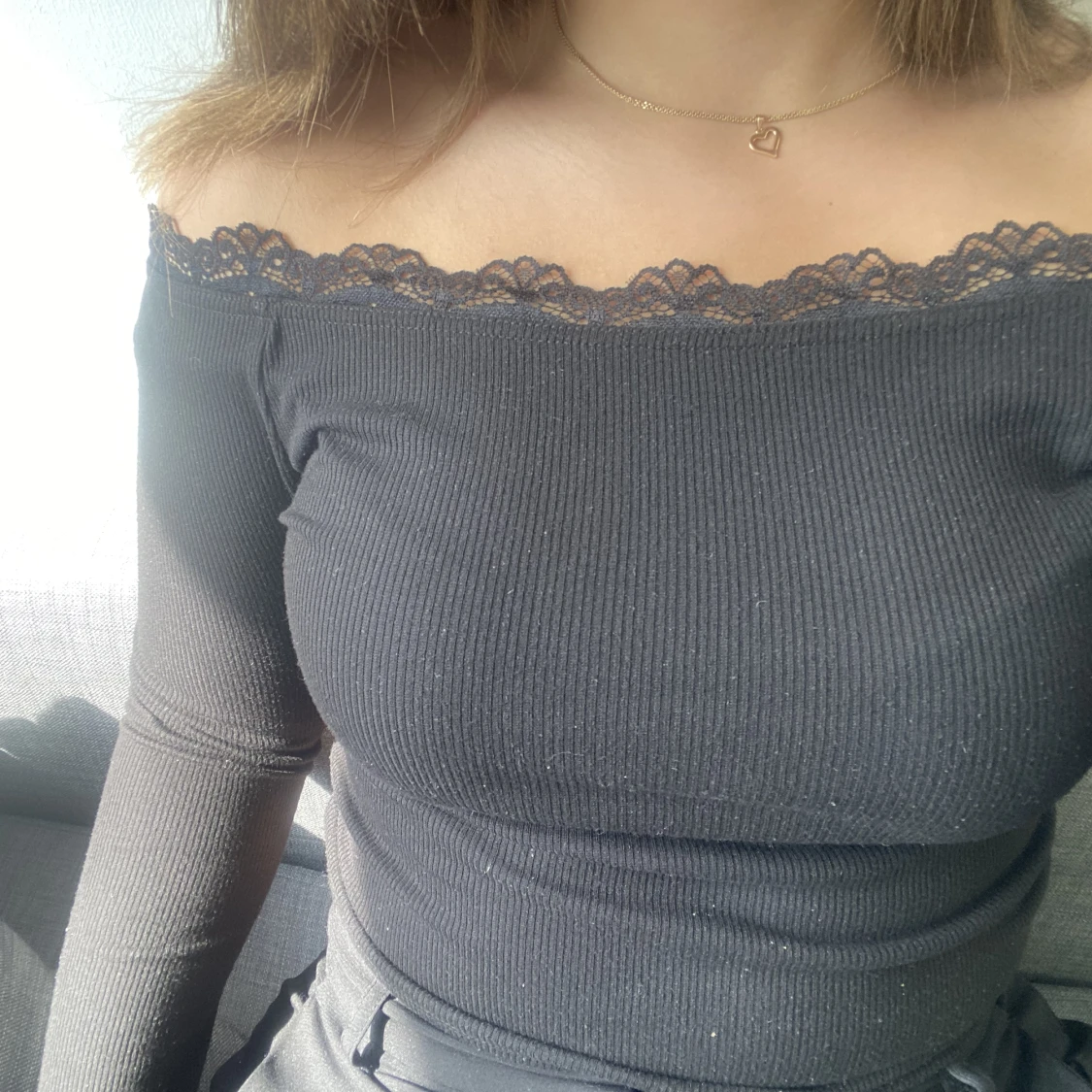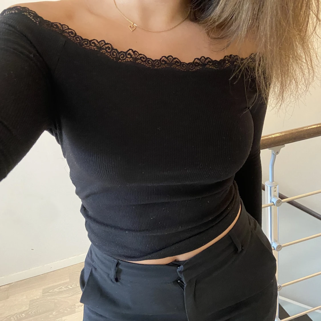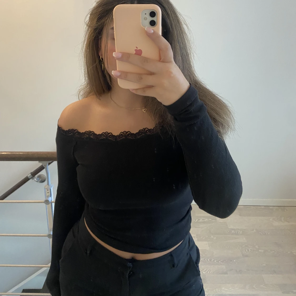Säljer denna svarta off shoulder toppen med spets runt hela💫 Ribbad och sparsamt använd alltså inga hål eller liknande. Kan tänka mig även passa M