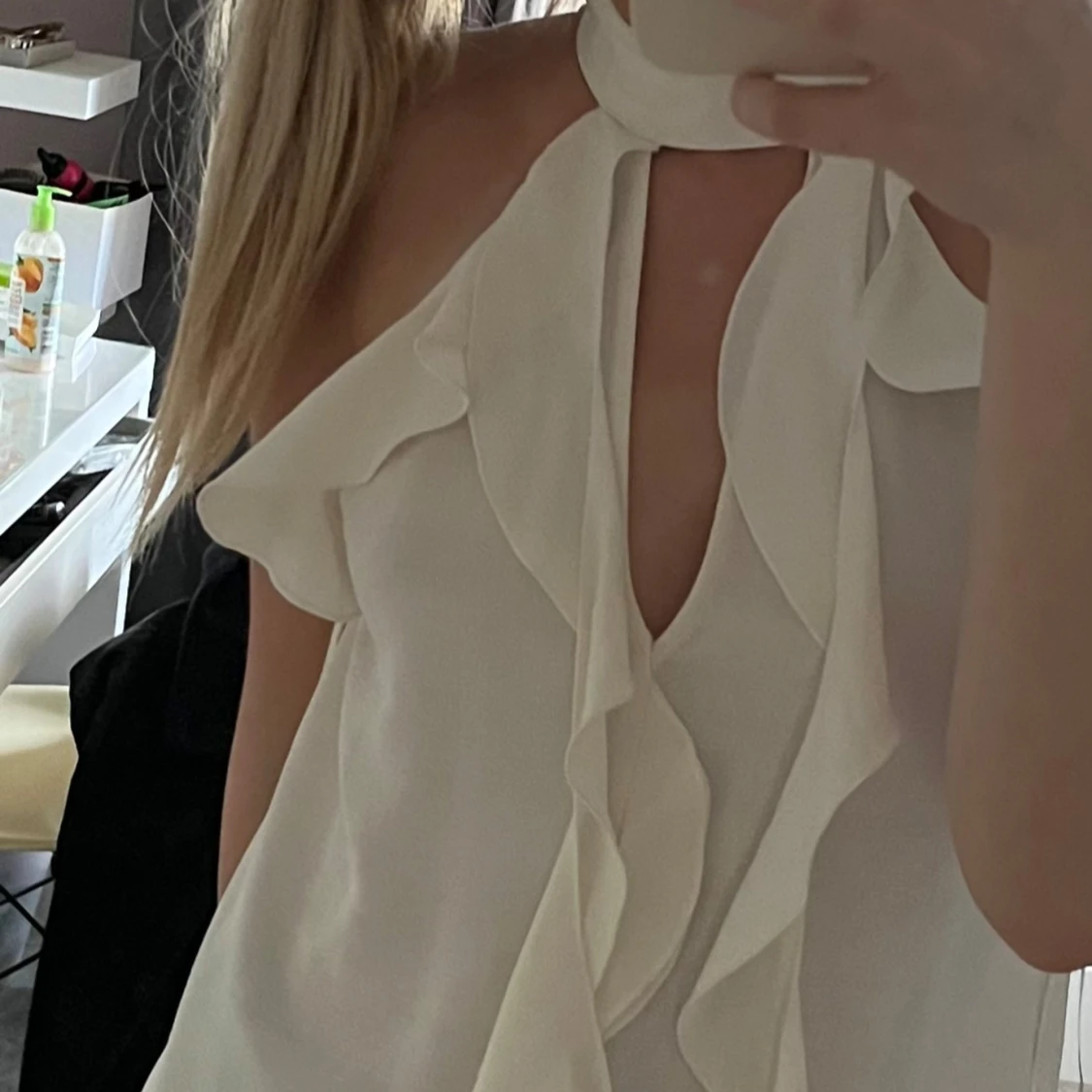 Säljer en elegant vit blus med volangdetaljer och hög hals💞💞