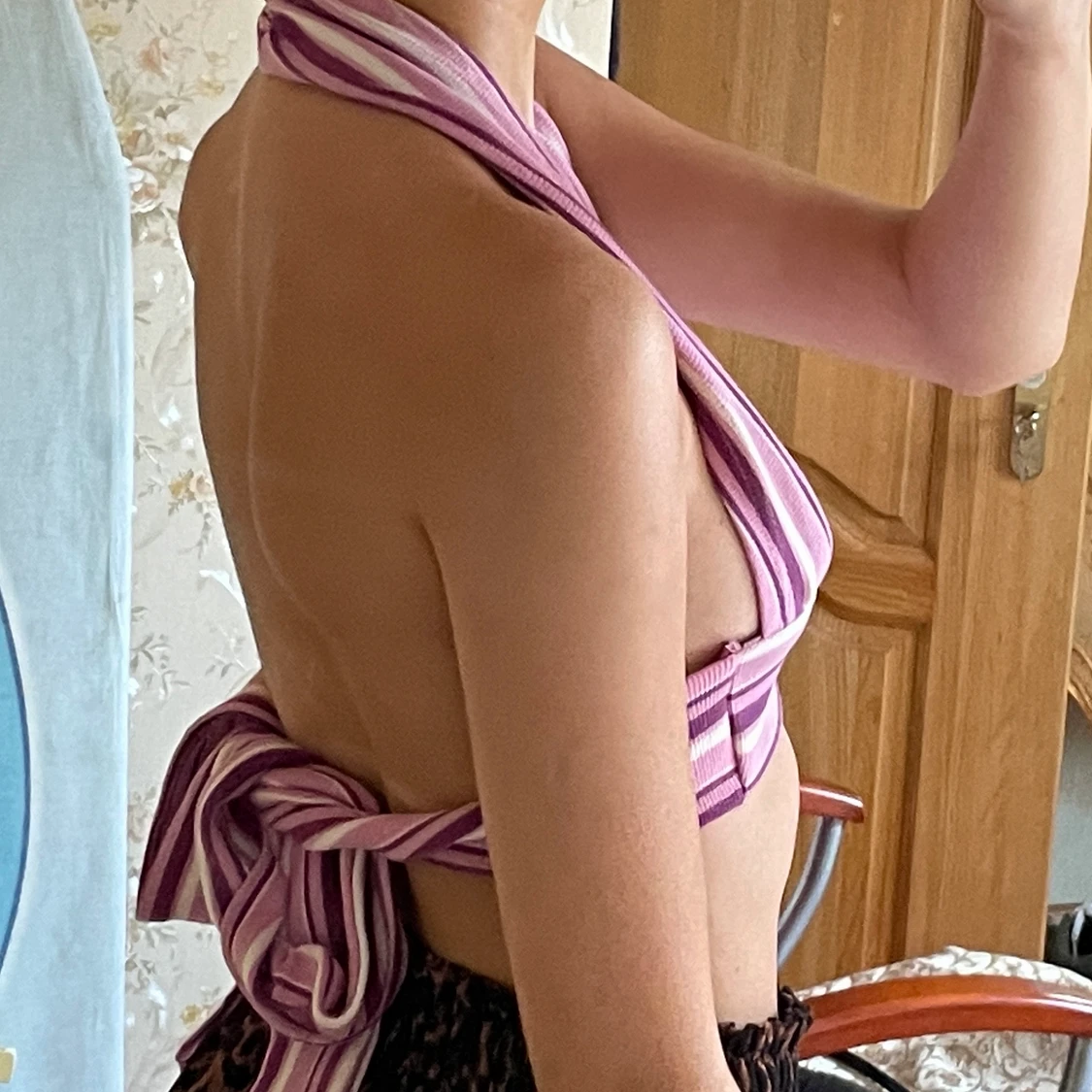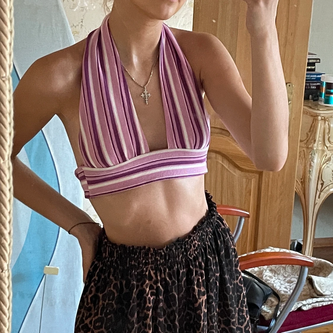 Säljer min halterneck topp för att jag har för många nu. Den är i storlek S men passar upp till L skulle jag säga för att man kan knyta upp den och göra den mindre och större. Den är i färgerna vitt lila och rosa vilket är en sååå fin kombination. Om du är som jag och gillar att ha bh på mig så är detta en halterneck som man faktiskt kan ha bh under utan att det ser konstigt ut. Köpte den på zalando för 290kr men säljer den nu för 80kr +frakt 20kr eller möts upp vid Odenplan