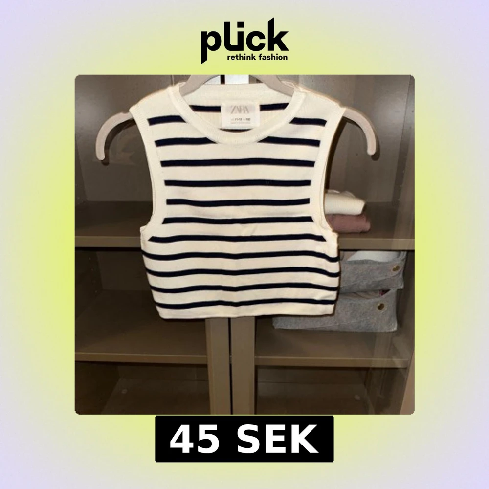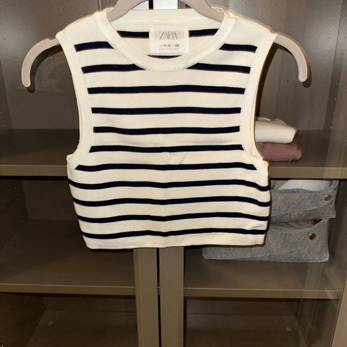 Säljer en snygg ärmlös topp från Zara i vitt med svarta ränder. Toppen är ribbad och croppad, perfekt för en stilren look. Passar bra till både jeans och kjol.