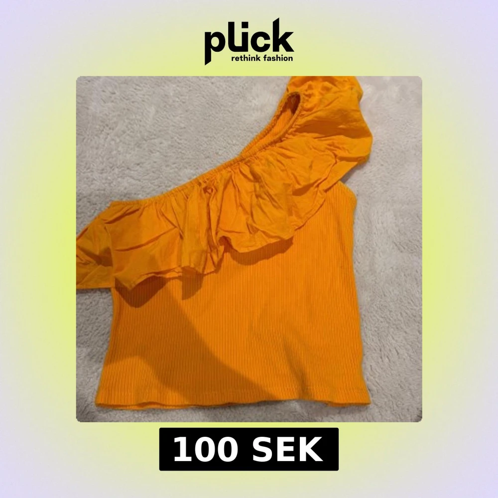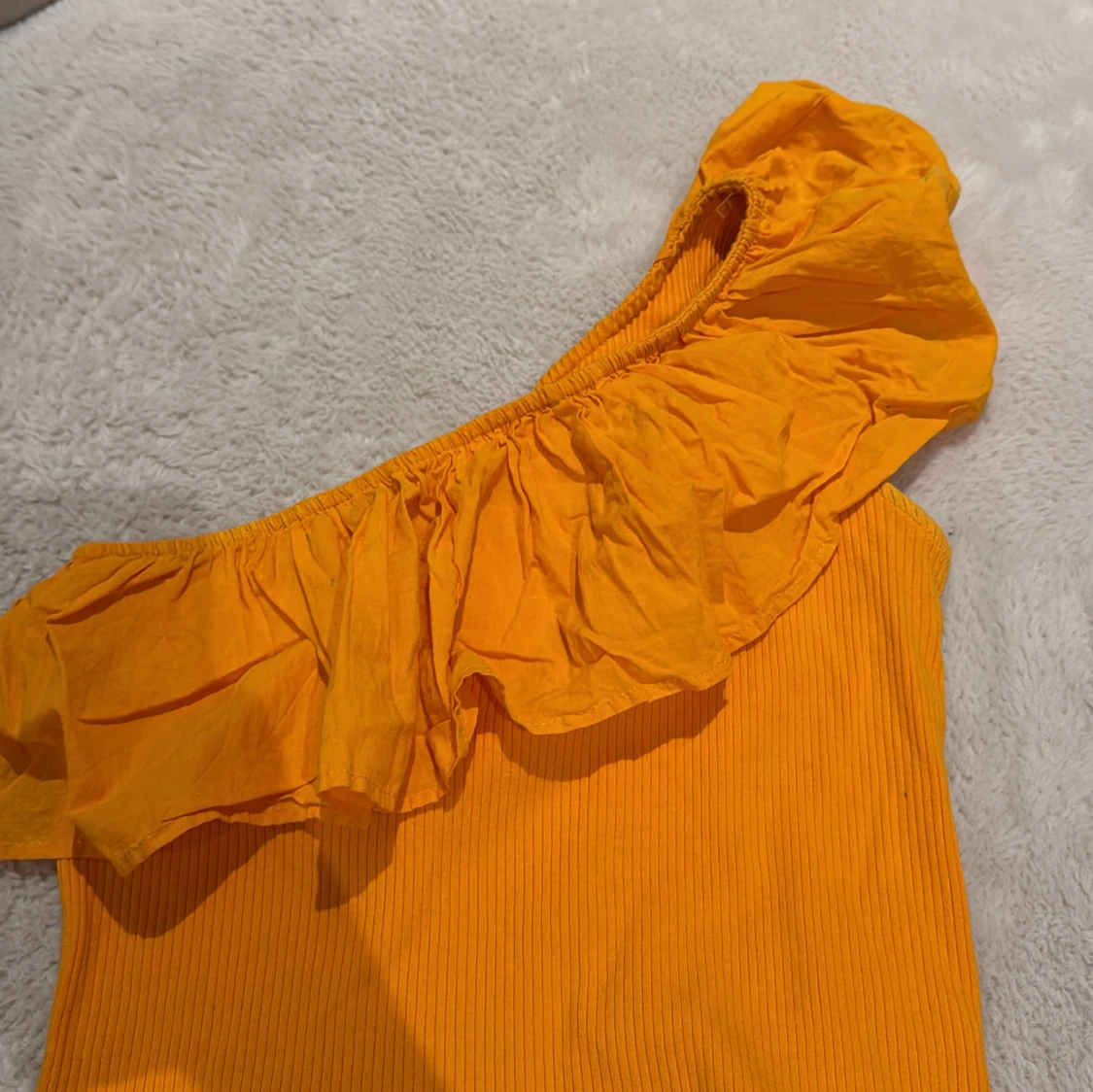 Säljer en superfin orange one shoulder topp från Zara. Toppen är ribbad och har en bred volang längs den asymmetriska axeln. Perfekt för dig som vill sticka ut med en färgglad och trendig look. Materialet är mjukt och stretchigt för en bekväm passform.