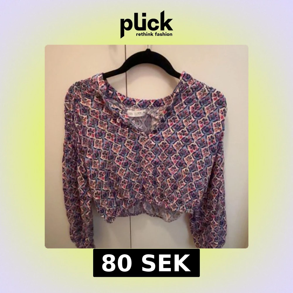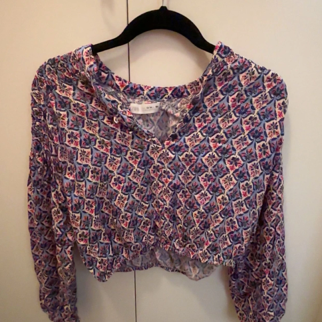 Säljer en blommig omlottblus från H&M med långärmade puffiga ärmar och croppad passform. Blusen har ett färgglatt mönster i blått, rosa och vitt, och är gjord i tunn bomull. Perfekt för dig som gillar boho-vibe och snygga detaljer.