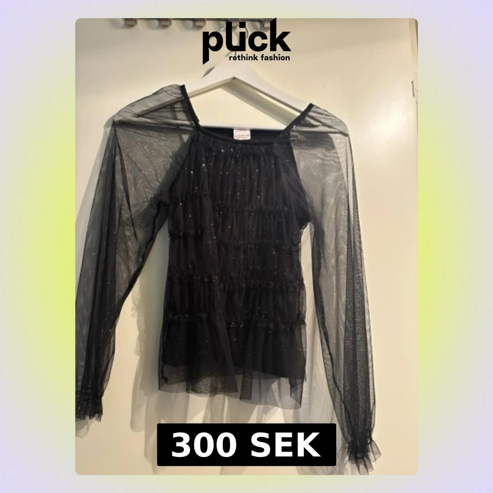 Säljer en svart mesh topp från Zara med långa ärmar och glittriga detaljer. Toppen har volanger framtill och är transparent i ärmarna för en extra cool look. Perfekt för dig som vill sticka ut lite extra.