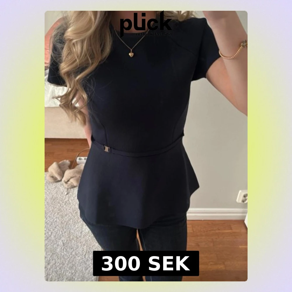 Snygg mörkblå peplum topp från Zara med korta ärmar och rund halsringning. Toppen har ett smalt bälte i midjan.