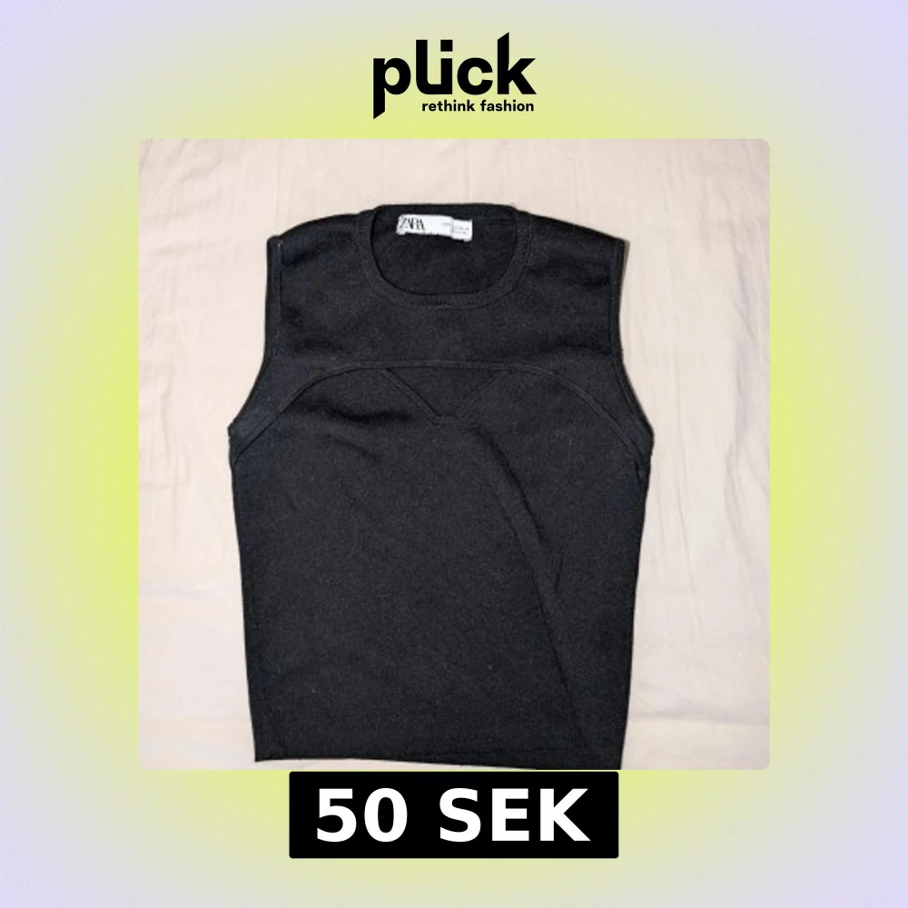 Svart stickad croptop från Zara med rund halsringning och cool detaljsöm över bröstet. Toppen är ärmlös och har en enkel, stilren design. Katt finns i hemmet.