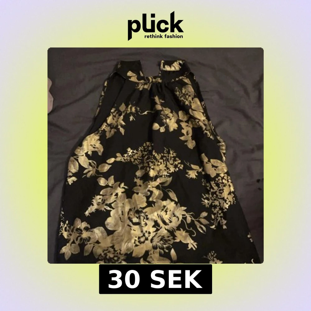 Snygg svart kortklänning med guldiga blommor och hög hals. Toppen är ärmlös och har ett elegant blommigt mönster som verkligen sticker ut. Perfekt för dig som vill ha en unik och glamorös look. Materialet känns mjukt och har en lätt glans.