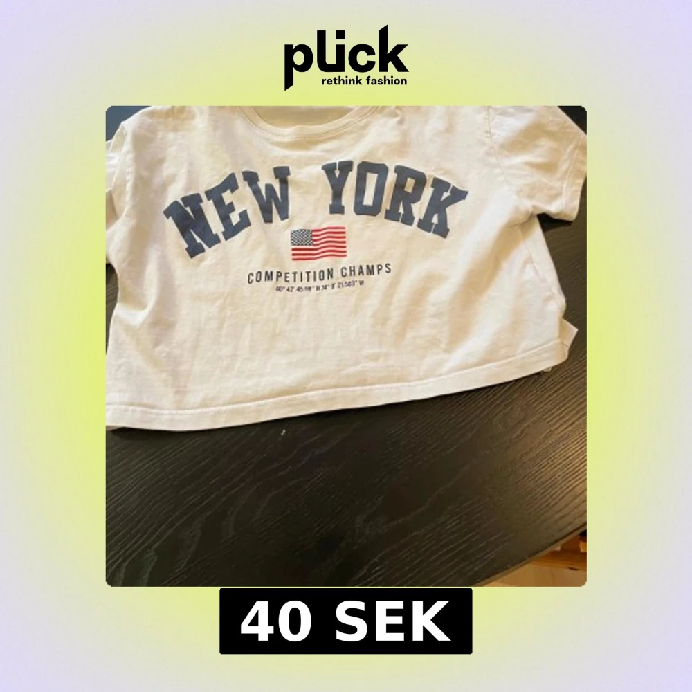 Vit croppad t-shirt från Zara med stort blått New York-tryck och amerikansk flagga på bröstet. Texten 'Competition Champs' och koordinater under flaggan. Perfekt för en avslappnad stil.
