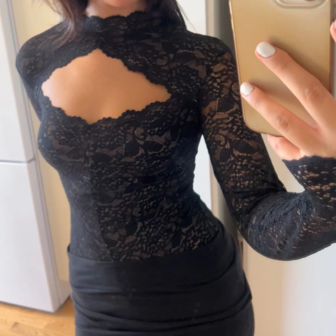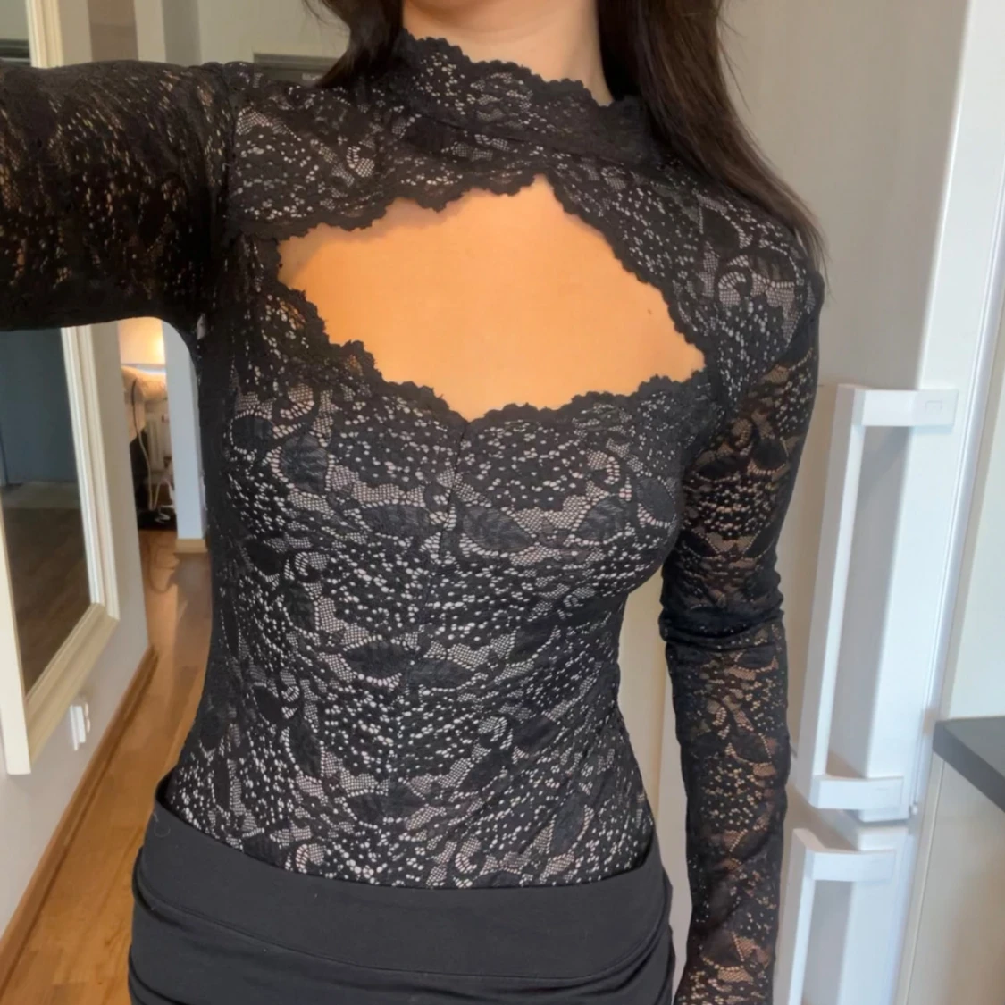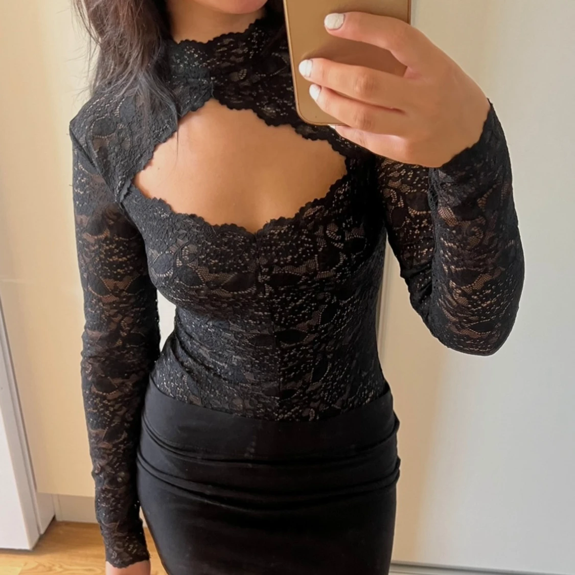 Säljer denna unika spetsbodyn med så fin urringning i storlek XS! Smickrande och klär upp vilken outfit som helst 🖤🖤