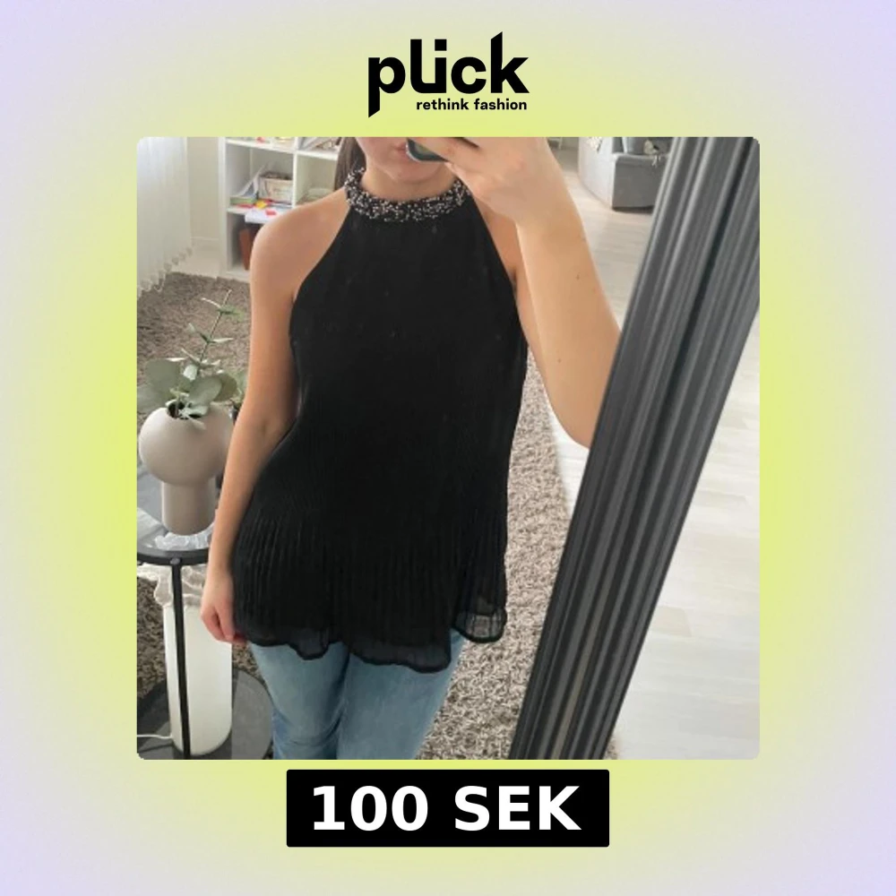 Snygg svart ärmlös topp med hög hals och vackra pärldetaljer runt kragen. Toppen har en elegant plisserad design och är perfekt för en stilfull look. Passar bra till både jeans och kjol.