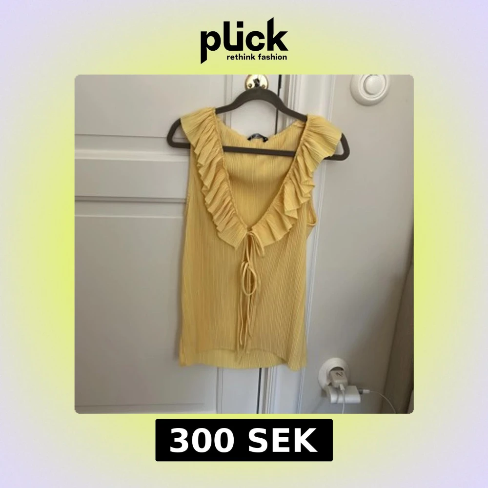 Säljer en ljusgul ärmlös topp från Zara med djup v-ringning och volangkant längs ringningen. Toppen har knytband framtill och är tillverkad i ett lätt, plisserat material. Perfekt för vår och sommar!