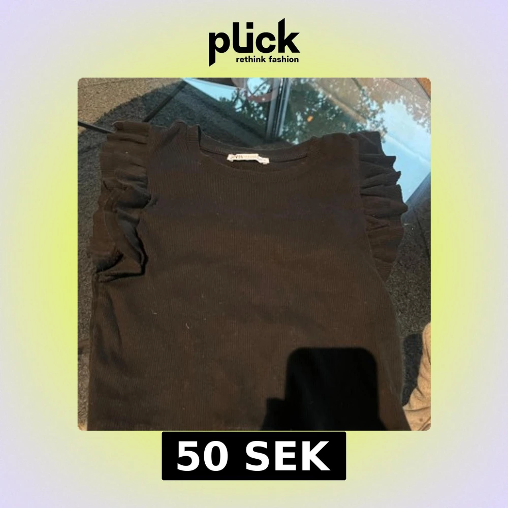 Svart ribbad topp från Zara med korta volangärmar. Toppen har en rund halsringning och är tillverkad i ett mjukt, stretchigt material som sitter bekvämt. Är något liten i storlek. Skriv till mig om ni har frågor!😊🫶🩷