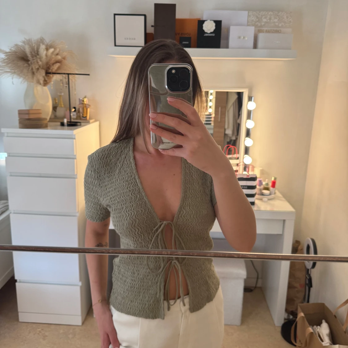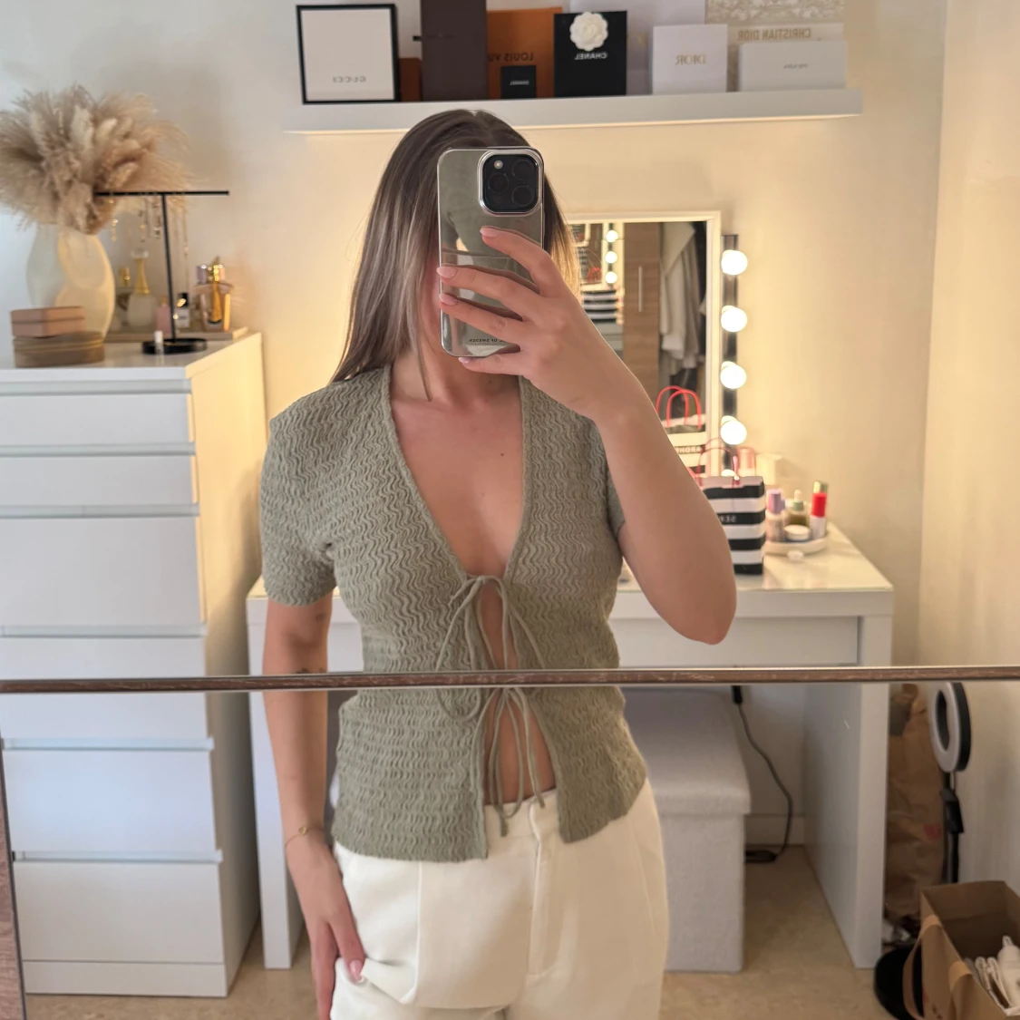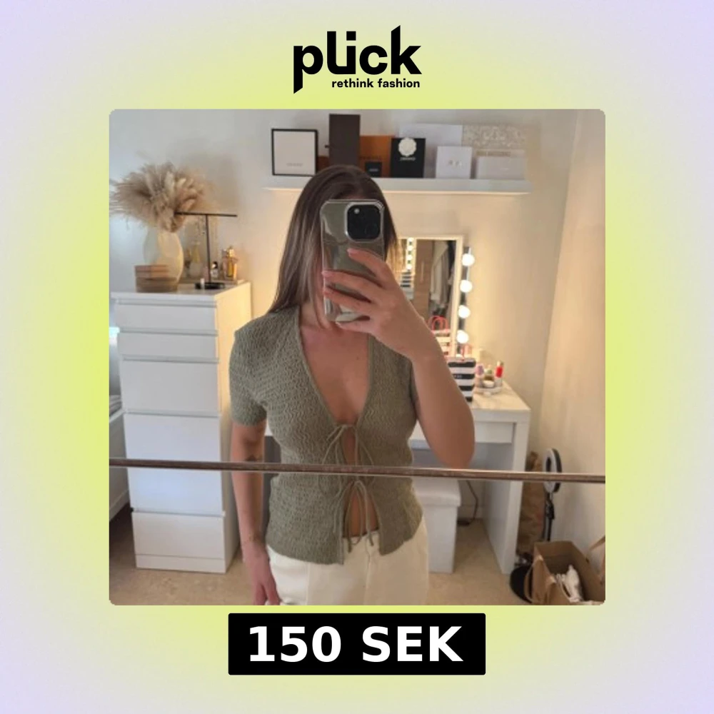 Säljer en snygg grön ribbad blus med knytning framtill. Blusen har korta ärmar och är i storlek S. Köpt från Zara.