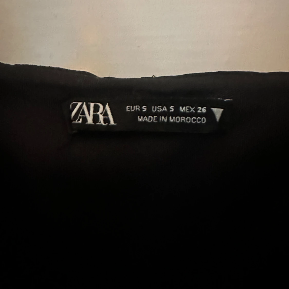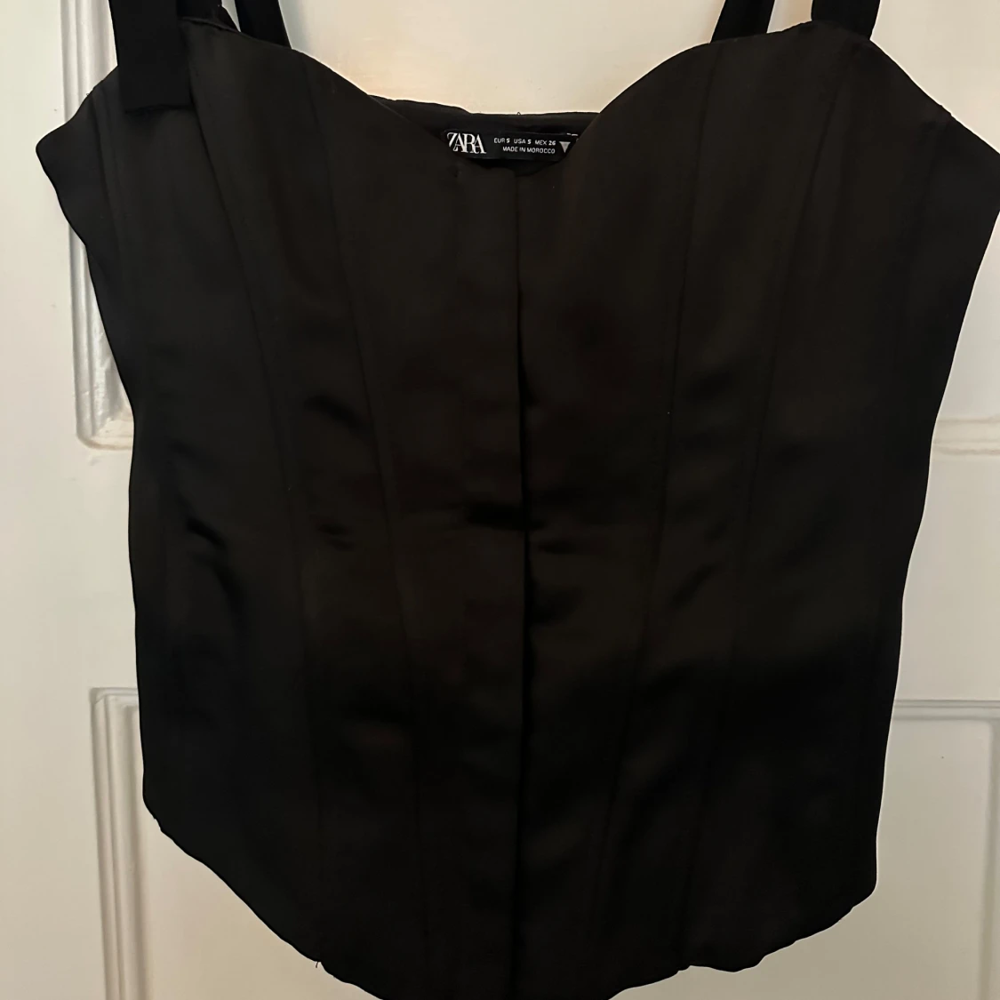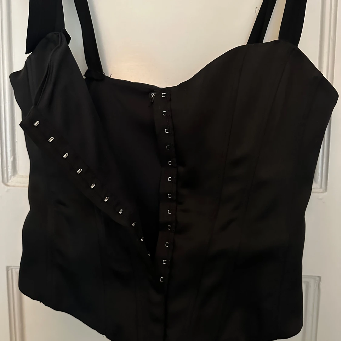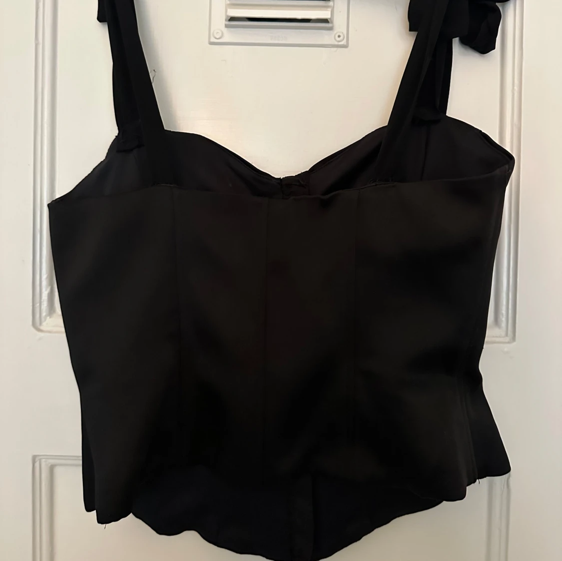 Snygg svart korsett från Zara med knytband på axlarna och hakknäppning framtill. Knytbanden har jag sytt dit själv och går att justera längd genom rosetten. De går enkelt att sprätta upp om man vill. Perfekt för en stilren look. Tillverkad i ett glansigt material som ger en lyxig känsla. Den är använd 2 gånger så den har lite böjningar men det är inget som syns när man har på den.