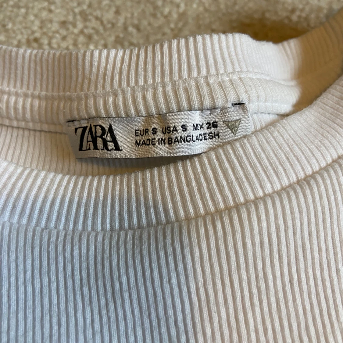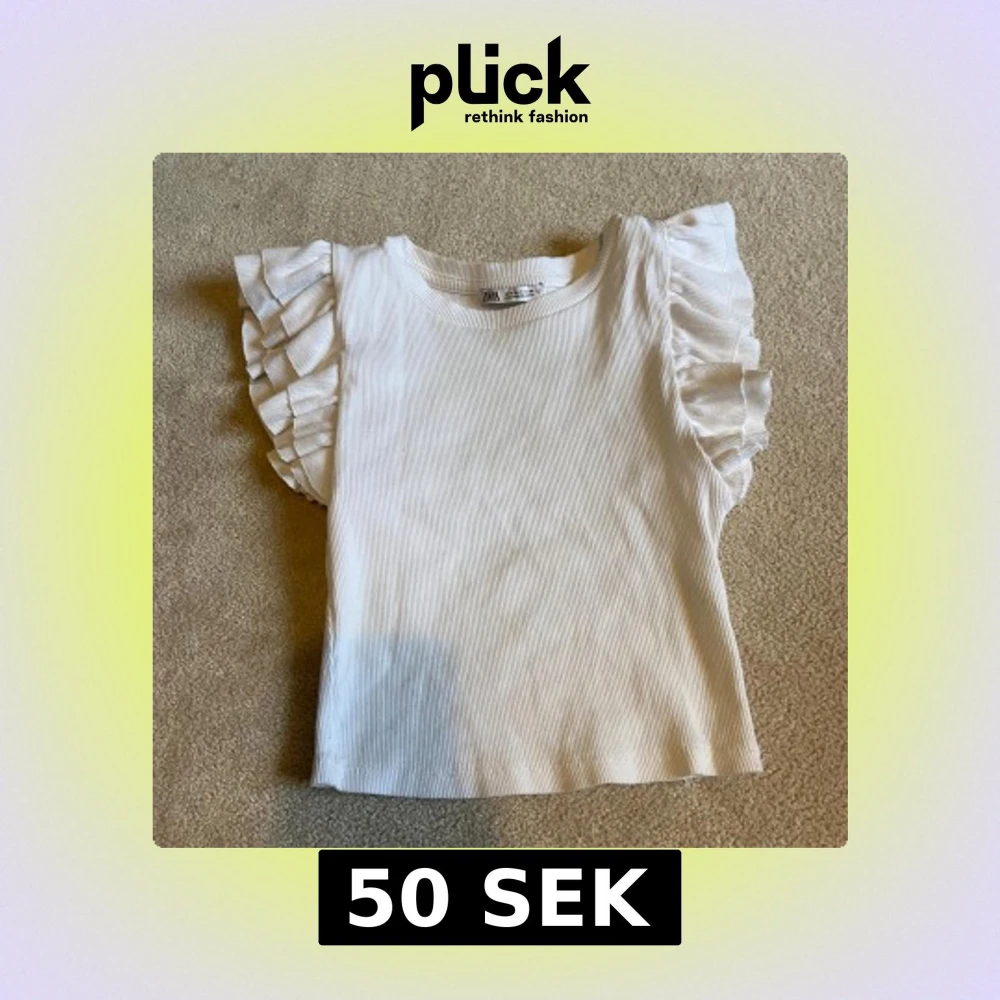 Säljer en söt vit ribbad topp från Zara med volangdetaljer på ärmarna. Perfekt för en gullig stil. Toppen är i storlek S och passar utmärkt till både jeans och kjol.