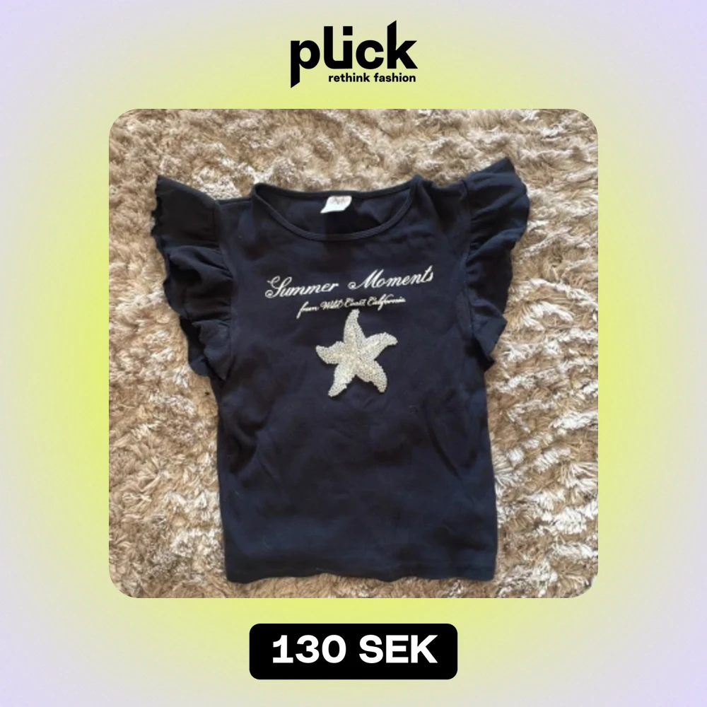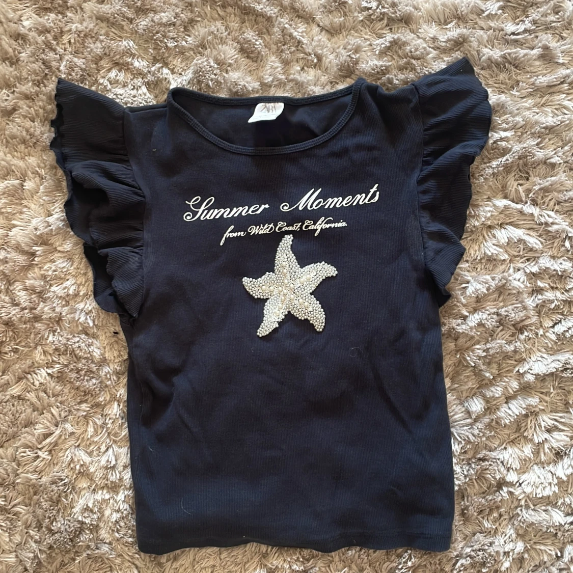 Säljer en snygg mörkblå topp från Zara med texten 'Summer Moments from West Coast California' och en glittrig sjöstjärna på framsidan. Toppen har volangärmar som ger en extra touch av stil. Perfekt för sommarens alla äventyr!