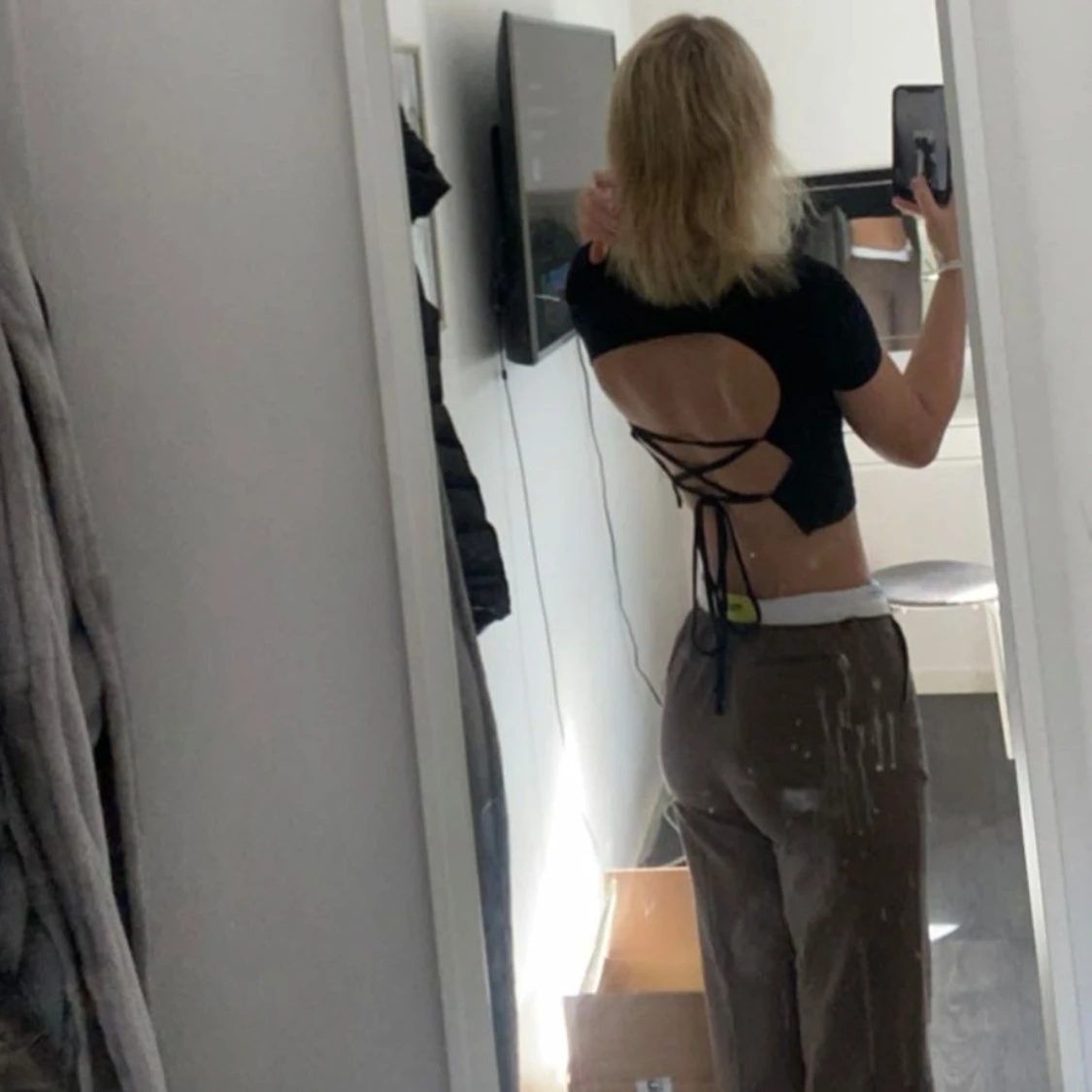 Snygg svart croppad topp med korta ärmar och öppen rygg med snörning.