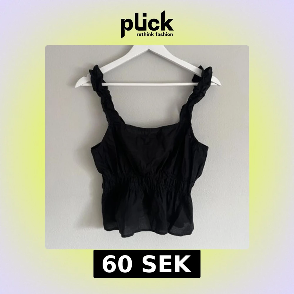 Snygg svart linnetopp med volangdetaljer på axelbanden. Toppen har en elastisk midja som ger en smickrande passform. Perfekt för varma sommardagar eller en kväll ute.
