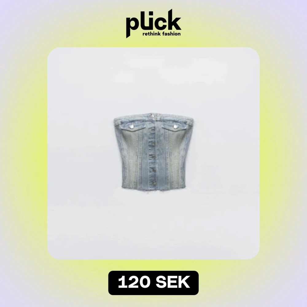 Zara jeanstopp - Säljer en snygg jeans korsettopp med markerade sömmar och silverfärgade knappar framtill. Toppen har en croppad passform och råa kanter nertill för en trendig look. Perfekt att styla till kjol eller byxor.