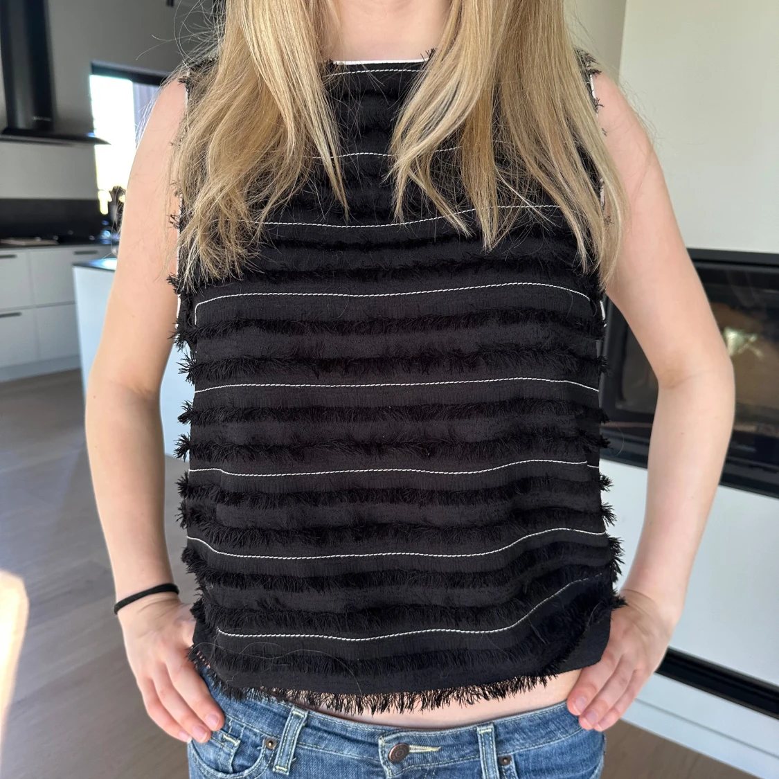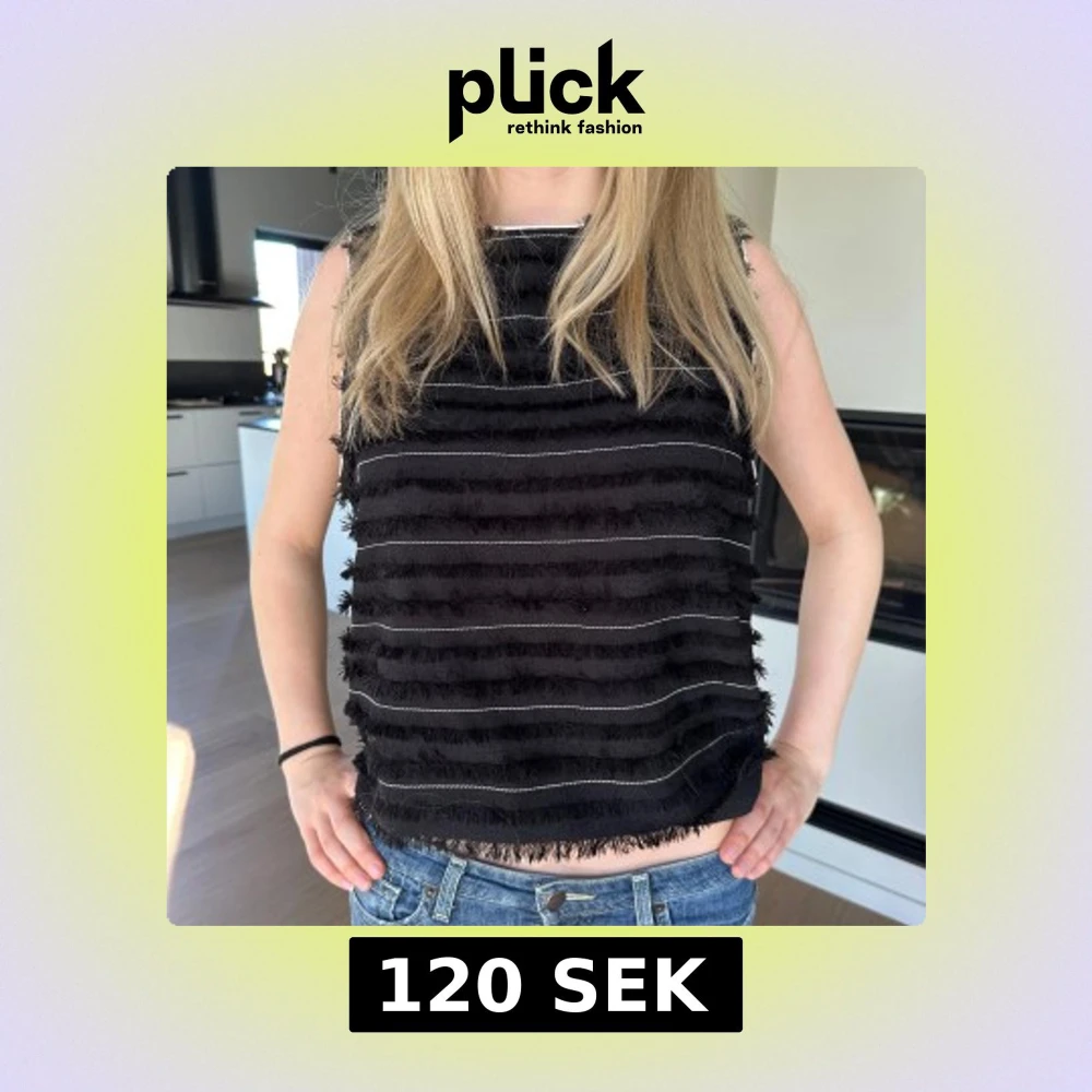 Säljer en svart ärmlös topp med horisontella fransar och tunna vita linjer på framsidan. Toppen har en rak passform och är tillverkad i ett mjukt material. Perfekt för att ge outfiten lite edge! Storlek L men passar mig som vanligtvis har S/M