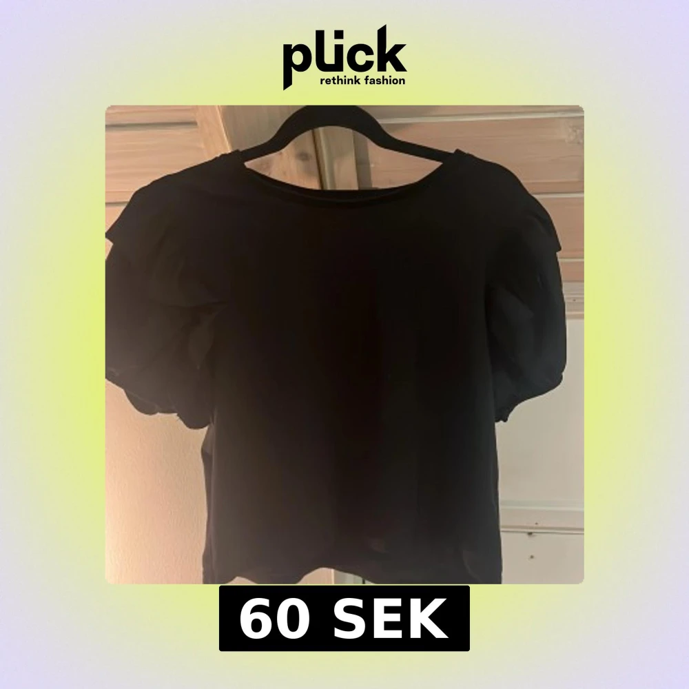 Säljer en svart T-shirt med korta, puffiga ärmar i tunt tyg. Toppen har rund halsringning och en croppad passform som ger en trendig look. Perfekt att styla med jeans eller kjol för en cool vibe.