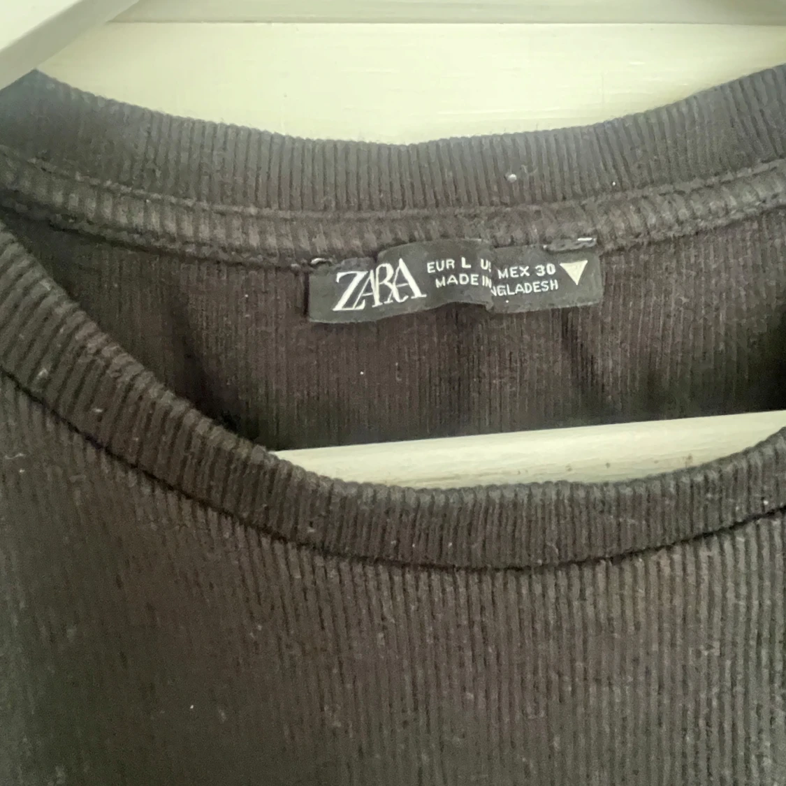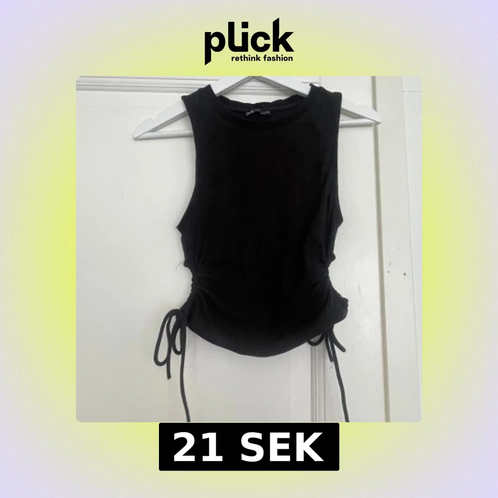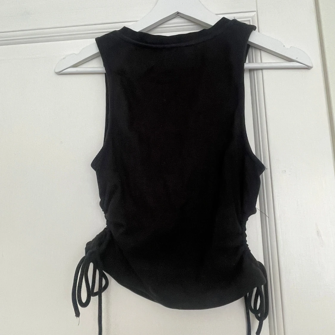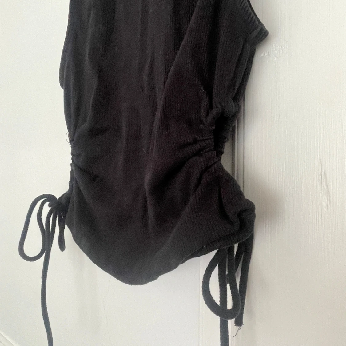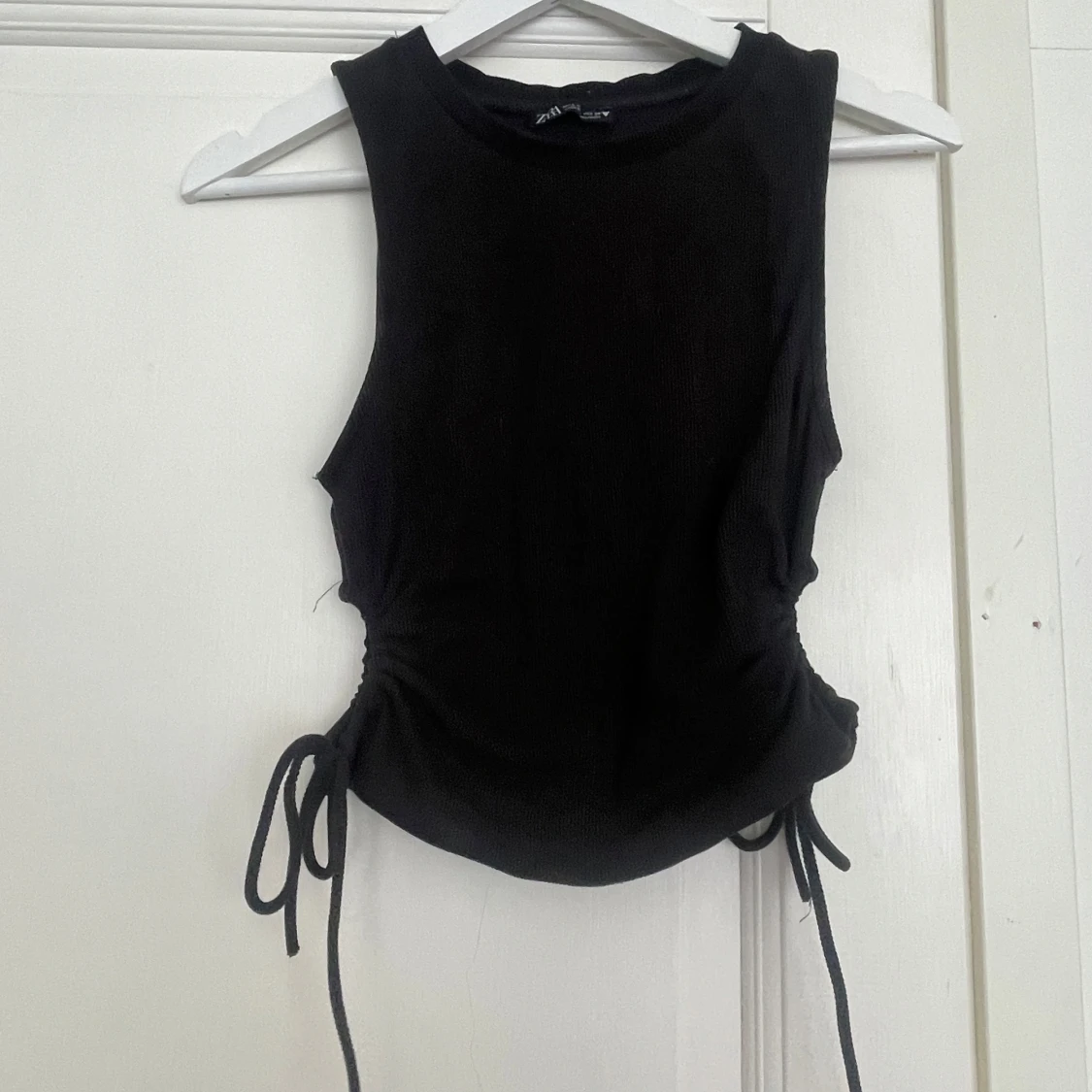 Säljer en svart ribbad linnetopp från Zara med snygga knytband i sidorna. Toppen är ärmlös och har en croppad passform som ger en cool och trendig look. Perfekt att matcha med höga jeans eller kjol för en stilren outfit.